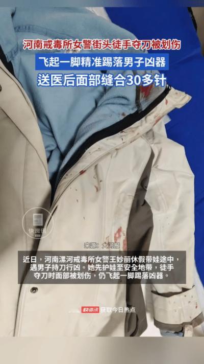 点赞!街头惊险一刻,女警英勇出手…… 元旦假期,本是与家人相伴的温馨时光,然而河南省第二强制隔离戒毒所的女警王妙丽,却经历了一场惊心动魄的生死较量。 1月3日17时30分,漯河市某公司门口,夕阳的余晖洒在地面。王妙丽正带着孩子路过,突然,不远处两名男子的激烈争执吸引了她的注意。还未等她反应过来,其中一名男子竟猛地从三轮车上抽出一把利刃,朝着对方挥刀猛刺。 千钧一发之际,王妙丽没有丝毫犹豫,迅速将孩子推到安全地带,自己则一个箭步冲上前,试图制止这场危机。利刃无眼,在徒手夺刀的过程中,她的左侧脸颊、耳部、嘴唇等处被利刃划伤,鲜血瞬间涌出。但她全然不顾,瞅准时机,飞起一脚踢落了男子手中的凶器。 男子见状,驾驶三轮车企图逃跑。王妙丽强忍剧痛,死死抓住三轮车不放。最终,在热心群众的协助下,成功将男子控制,直至公安民警赶到。 随后,王妙丽被紧急送往医院,她的面部缝合了30余针,伤口最深达1厘米,最长近5厘米。好在,目前她已脱离危险。 这位英勇的女警,用行动诠释了什么是责任与担当。她是人民的守护者,是当之无愧的巾帼英雄。 你身边有没有遇到过这样勇敢无畏的人或事呢?欢迎分享。 禁毒女警英勇事迹 女警徒手夺刀 致敬人民卫士禁毒女警 点赞河南女警王妙丽
