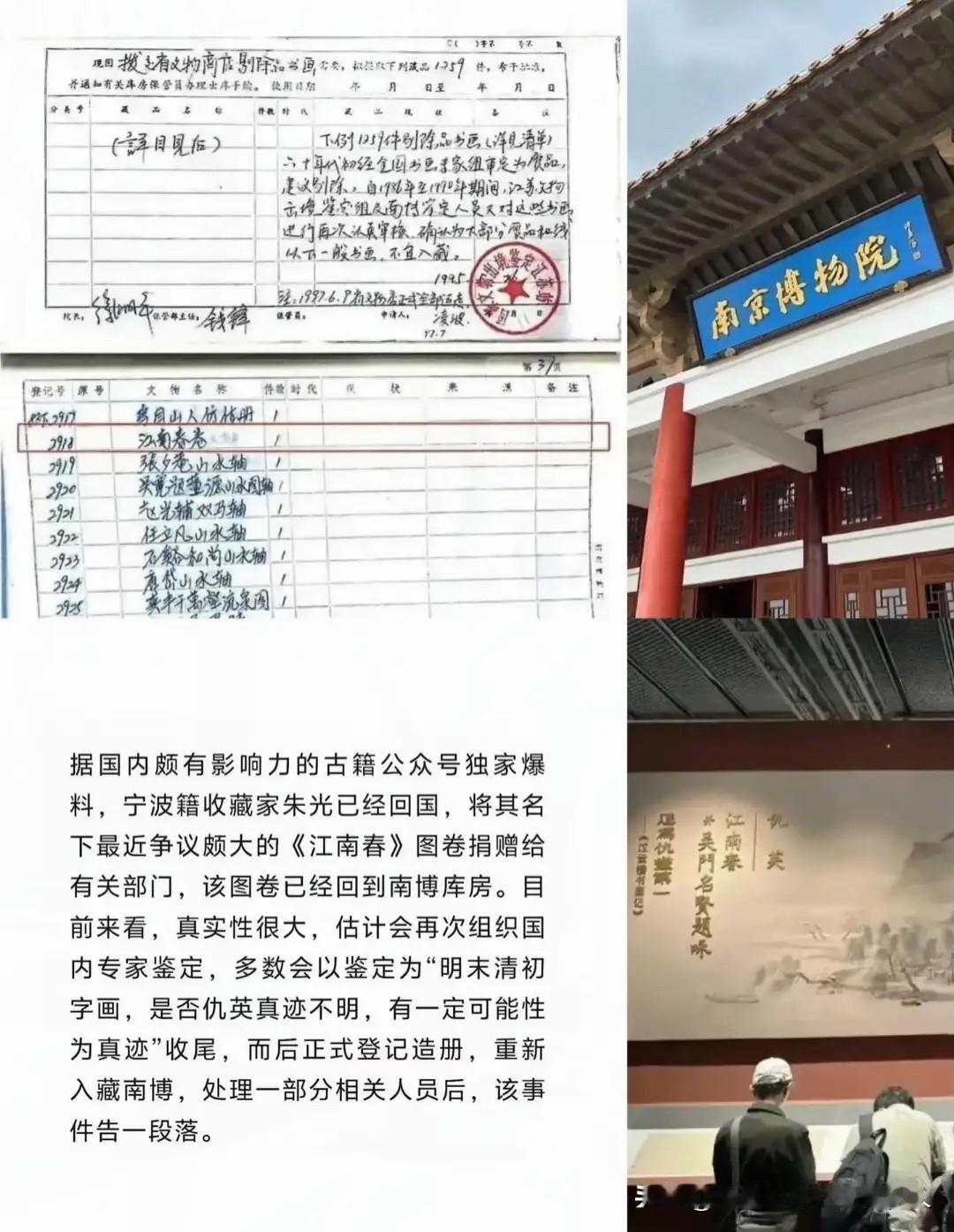 时隔一个月,买走《江南春》的人终于现身了!是位宁波商人,特意从澳大利亚紧急赶回来,把画归还了南京博物院,现在画作已经存放在南博库房里了。 这事本身我倒不好奇,我更关心俩问题:一是这画最后会不会还给庞家后人?毕竟当初是庞家无偿捐赠的;二是要是鉴定后确认是假的,该追究谁的责任?毕竟画从博物馆流出去又几经转手,流程得说清。 不过有人觉得“小事化了”就行,还说查了结果也不会公开。但我不这么看,这事儿关系文物保护和公众信任,不能含糊。相关部门已经介入调查,相信会按法律和规定来,给庞家、给公众一个透明的交代。文物是国家和民族的财富,把来龙去脉查清楚,才是对历史负责,也能完善文物管理的漏洞呀。