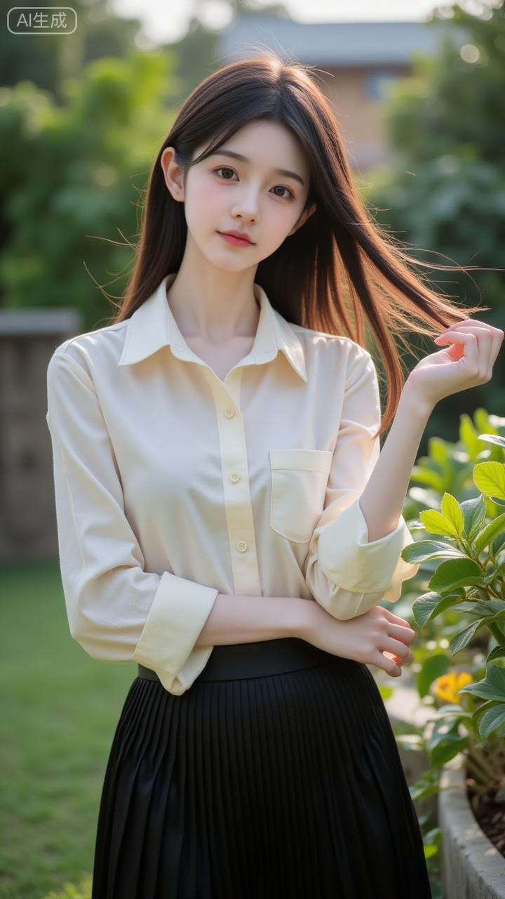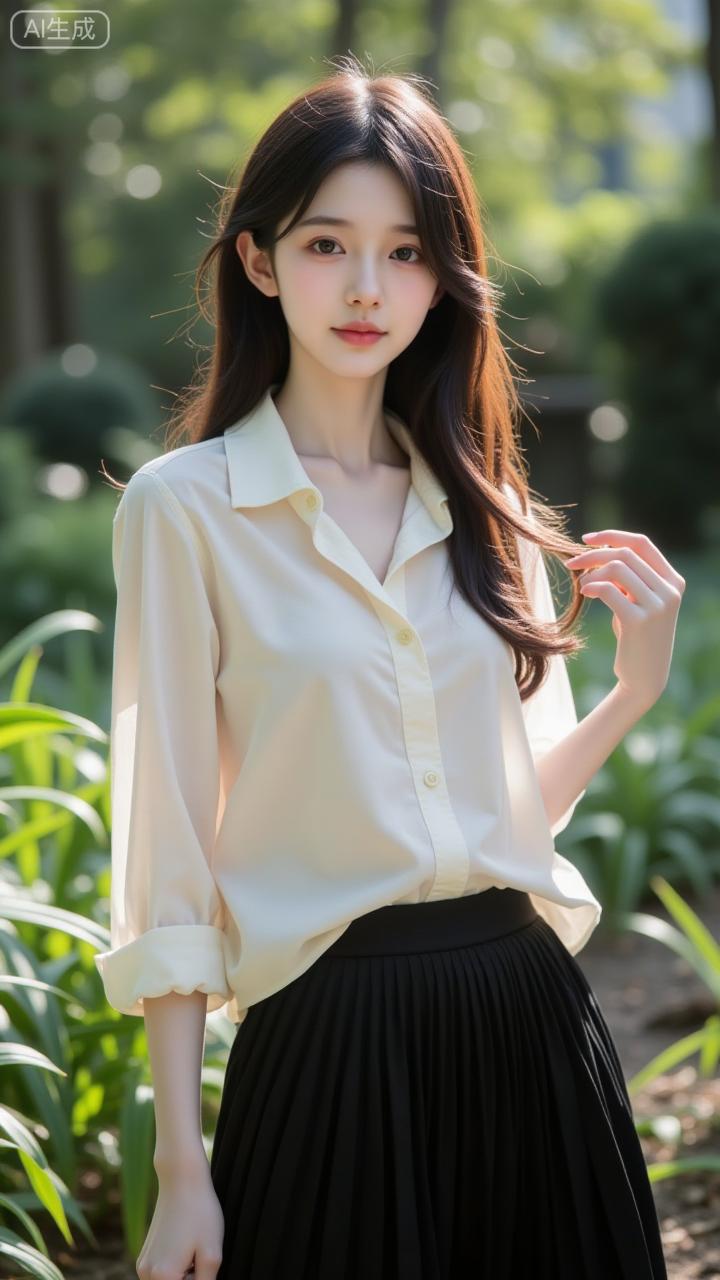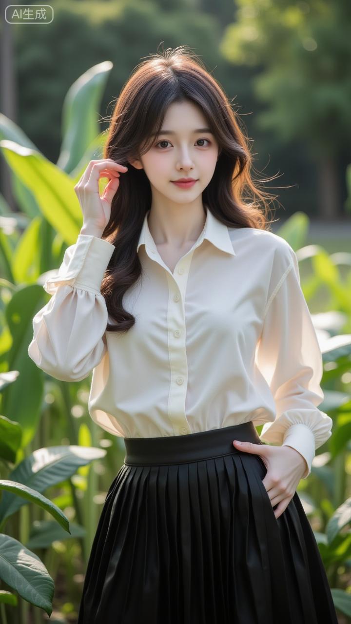 浅夏林间,素衫黑裙太戳审美 米白衬衫衬得气质清透,黑百褶裙添了几分柔,风撩起长发时,连空气都裹着温柔。这组林间随拍,是把“松弛氛围感”焊在身上了~白色印花衬衫裙 休闲风黑裙
