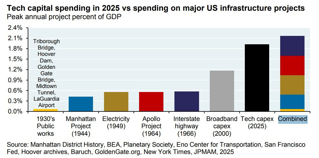 老美四家科技巨头在资本支出和研发上投入的收入份额越来越大。美国科技行业资本支出在过去三个季度对美国GDP的贡献超过了过往的主要基础设施项目,超过了登月计划,曼哈顿工程等。。。