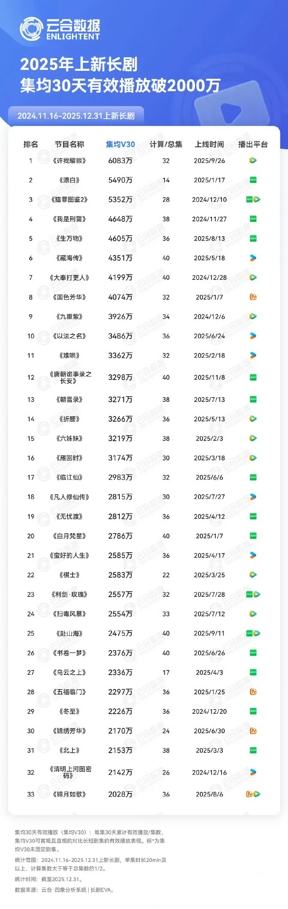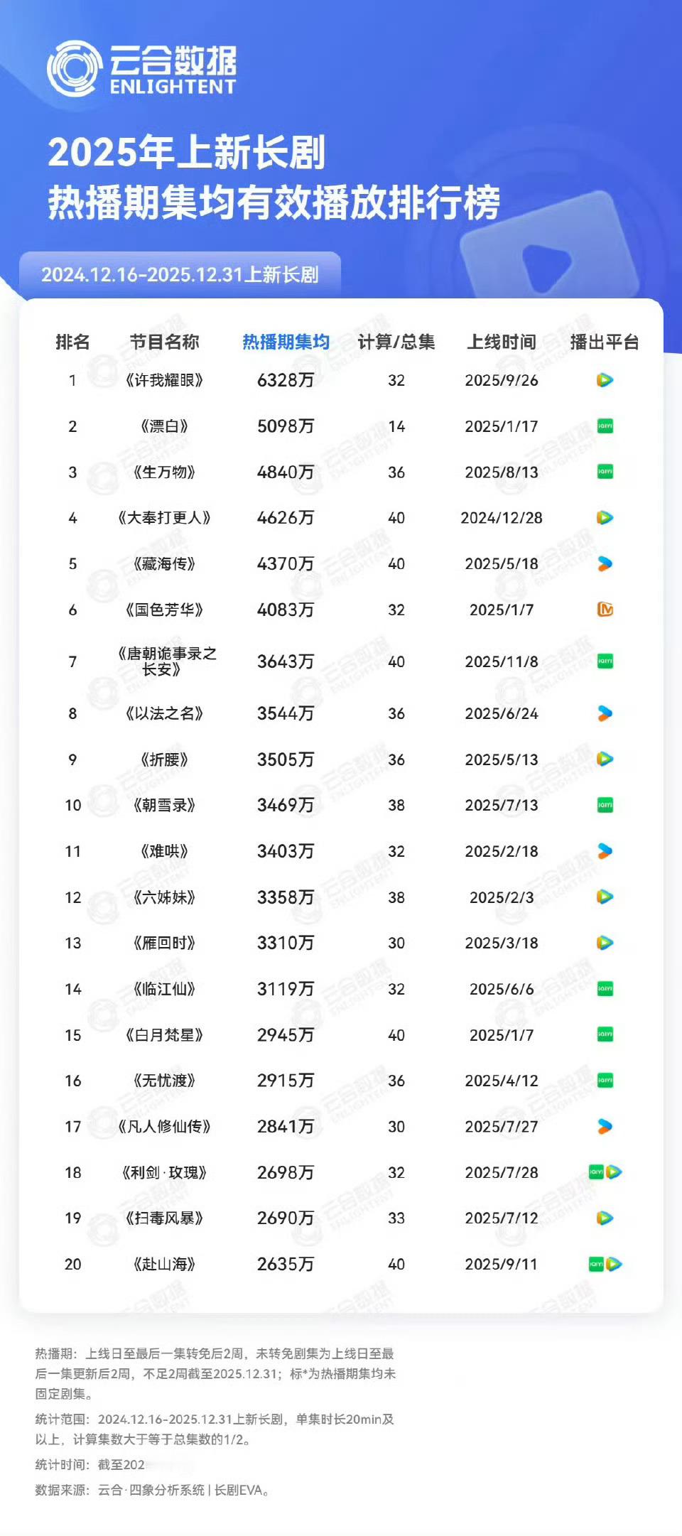 2025云合年榜来啦~📊累计有效播放霸屏榜TOP20📊集均V30有效播放破2000w📊热播期集均有效播放TOP20