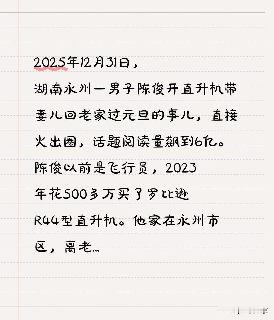 2025年12月31日,湖南永州一男子陈俊开直升机带妻儿回老家过元旦的事儿,直接