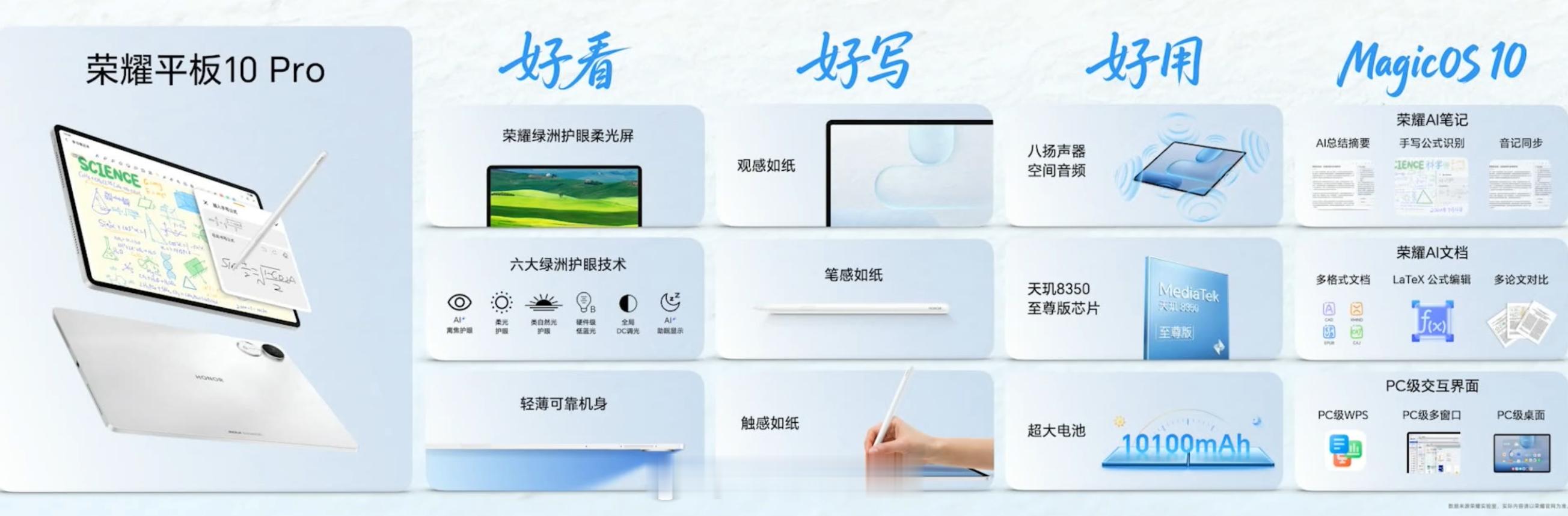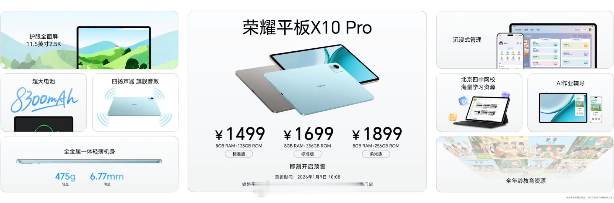 荣耀还发布了两款平板:荣耀平板 10 Pro:12+256GB 售价 2499 元、12+256GB 柔光版售价 2699 元荣耀 X10 Pro:8+128GB 售价 1499 元、8+256GB 售价 1699 元、8+256GB 柔光版售价 1899 元
