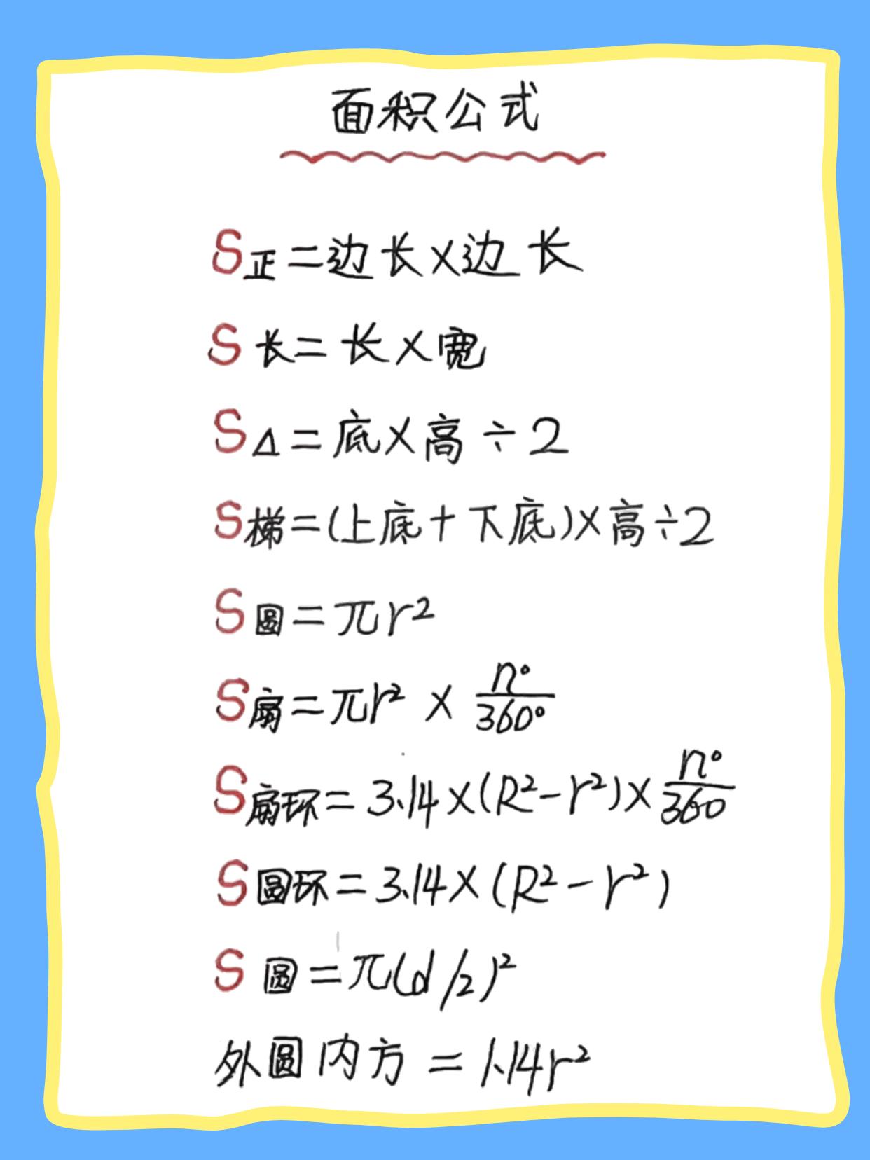 “最牛”班主任,熬夜将小学1-6年级数学常用公式全都整理了出来,全班同学靠这份公式数学成绩提升了一大截,家长们赶紧替孩子保存了,随时都能用得上。   想要孩子数学成绩好,数学公式一定要记牢,因为数学题目中,很多都是要靠公式来解题的,比如:计算三角形的面积。如果不会三角形的面积计算公式:底×高÷2,孩子孩子就不会解题。   其实,很多数学题的公式都差不多,想要灵活运用,除了把这些数学公式“吃透”之外,还要让孩子学会对公式进行分类,这样以后遇到同样的题型孩子就会做了,那么孩子的数学成绩自然更优秀。   下面这份数学公式包含小学1-6年级常用的数学公式,建议家长打印出来,让孩子每天背几个,打好数学基础,对提高孩子数学成绩很有帮助。   很多学霸都是自己整理,这里有现成的,家长动动手指自取即可,也可以转给身边有需要的人。