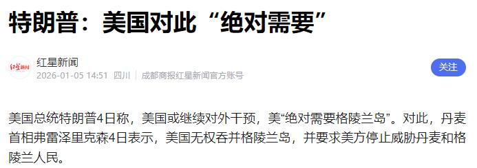委内瑞拉还没搞定,特朗普盯上新目标,欧盟和北约成了笑话! 当地时间1月3日凌晨,美军突然对委内瑞拉首都加拉加斯发动大规模军事打击,毫无征兆地强行控制了总统马杜罗及其夫人,并将二人带往美国关押,计划近期对其进行庭审。 这一单边军事行动彻底搅乱了委内瑞拉的局势,也引发了国际社会的强烈谴责。可特朗普对此毫不在意,反而在随后的新闻发布会上气焰嚣张地宣称,美国将直接“管理”委内瑞拉,直到完成所谓的“权力交接”,还直言委内瑞拉绝不会是美国干预的最后一个国家。 此前,美媒就频繁点名哥伦比亚、古巴、墨西哥等拉美国家,外界都以为美国接下来的干预目标会集中在拉美地区。毕竟特朗普政府一直将西半球视为自己的“后院”,新版国家安全战略里也明确要“退回西半球”,巩固所谓的“首要战略利益”。 可谁也没料到,特朗普突然改变主意,把矛头指向了北方,在接受采访时公然表态“我们美国绝对需要格陵兰岛”,这番言论瞬间引发了轩然大波。 格陵兰岛是丹麦的自治领地,特朗普的这番表态无疑是对丹麦主权的公然挑衅。丹麦首相弗雷泽里克森当即发表声明,严厉驳斥美方,明确表示美国无权吞并丹麦的任何一部分,要求美方立即停止这种毫无意义的威胁。 事实上,这已经不是特朗普第一次打格陵兰岛的主意了,早在去年他就多次表达过对格陵兰岛的觊觎,还任命过所谓的“格陵兰岛特使”,试图推动格陵兰岛加强对美国的依附,当时就遭到了丹麦和格陵兰岛方面的强烈反对。 也正是因为特朗普政府的持续威胁和不当行径,2025年12月10日,丹麦国防情报局在年度威胁评估报告中,首次将美国列为潜在安全威胁。 这一决定意义非凡,要知道丹麦和美国同为北约成员国,而美国正是北约的牵头国,如今出现北约成员国将牵头国列为威胁的情况,在北约历史上还是头一遭。 丹麦方面在报告中明确指出,美国正利用经济实力施压他国,甚至不排除对盟友使用武力,这种战略转变给丹麦的国家安全带来了新的不确定性。 这一局面让北约和欧盟彻底陷入了尴尬。长期以来,北约以“集体防御”为幌子,依附于美国的军事力量,欧盟也常与美国抱团施压其他国家。 可现在,作为“大哥”的美国,竟然公然威胁自己的盟友,还被盟友正式列为威胁,这无疑让北约的“团结”面具碎了一地,也让欧盟所谓的“协同外交”沦为空谈。 更讽刺的是,美国一边要求欧洲盟友承担更多防务责任,一边又对盟友肆意施压、觊觎利益,这种只讲霸权不讲道义的做法,让北约和欧盟的处境愈发难堪。 眼下,委内瑞拉局势依旧混乱,委方已经启动全面战备状态,坚决反抗美国的侵略,国际社会也纷纷呼吁美国立即释放马杜罗夫妇,停止非法干预。 而特朗普这边不仅没解决委内瑞拉的烂摊子,还在持续挑衅丹麦,试图染指格陵兰岛。这种四处树敌、肆意妄为的霸权行径,不仅破坏了国际秩序,也让美国的国际信誉一落千丈。 对于北约和欧盟来说,如何面对这样一个“威胁盟友”的牵头国,如何维护自身的尊严和利益,已经成了绕不开的难题,而他们此前紧跟美国的种种做法,如今看来更像是一场自取其辱的笑话。