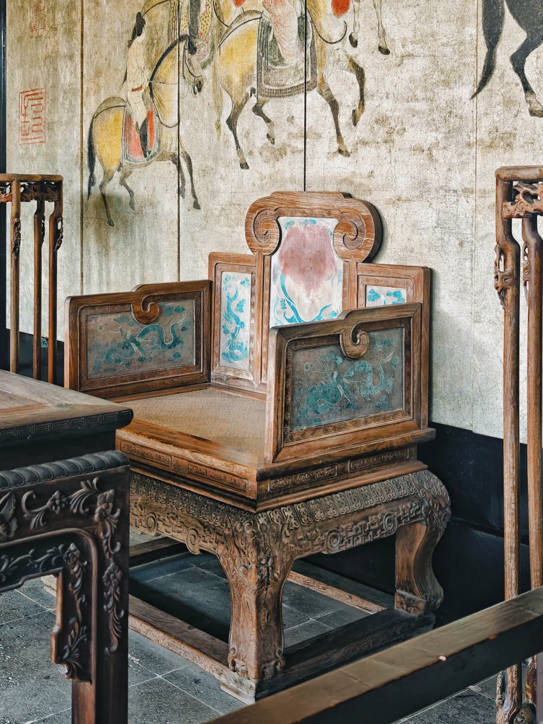 🏯主体建筑舞彩堂,为移建清代歇山顶草架六架堂屋,卷棚歇山顶,中间匾额“程子四箴”为刘墉所题。北堂屋正对后边戏台,此处有一件镇园之宝:乾隆在此处看戏御用的千年紫檀制成之龙椅,雕有九条金龙。这椅子据说本来在他的灵岩山行宫(行宫已毁。灵岩山我单独写了一篇,见主页),特地搬来此处。