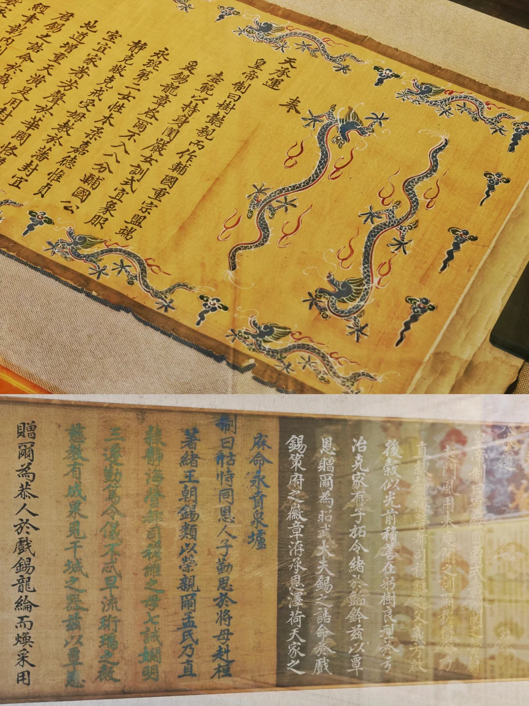 📜清代圣旨馆:陈列着清代十位皇帝的二十道圣旨。不同圣旨的用料反应了国力的盛衰,章总时期的江宁织造的七彩绫和光绪年间的粗布一比真是天上地下。