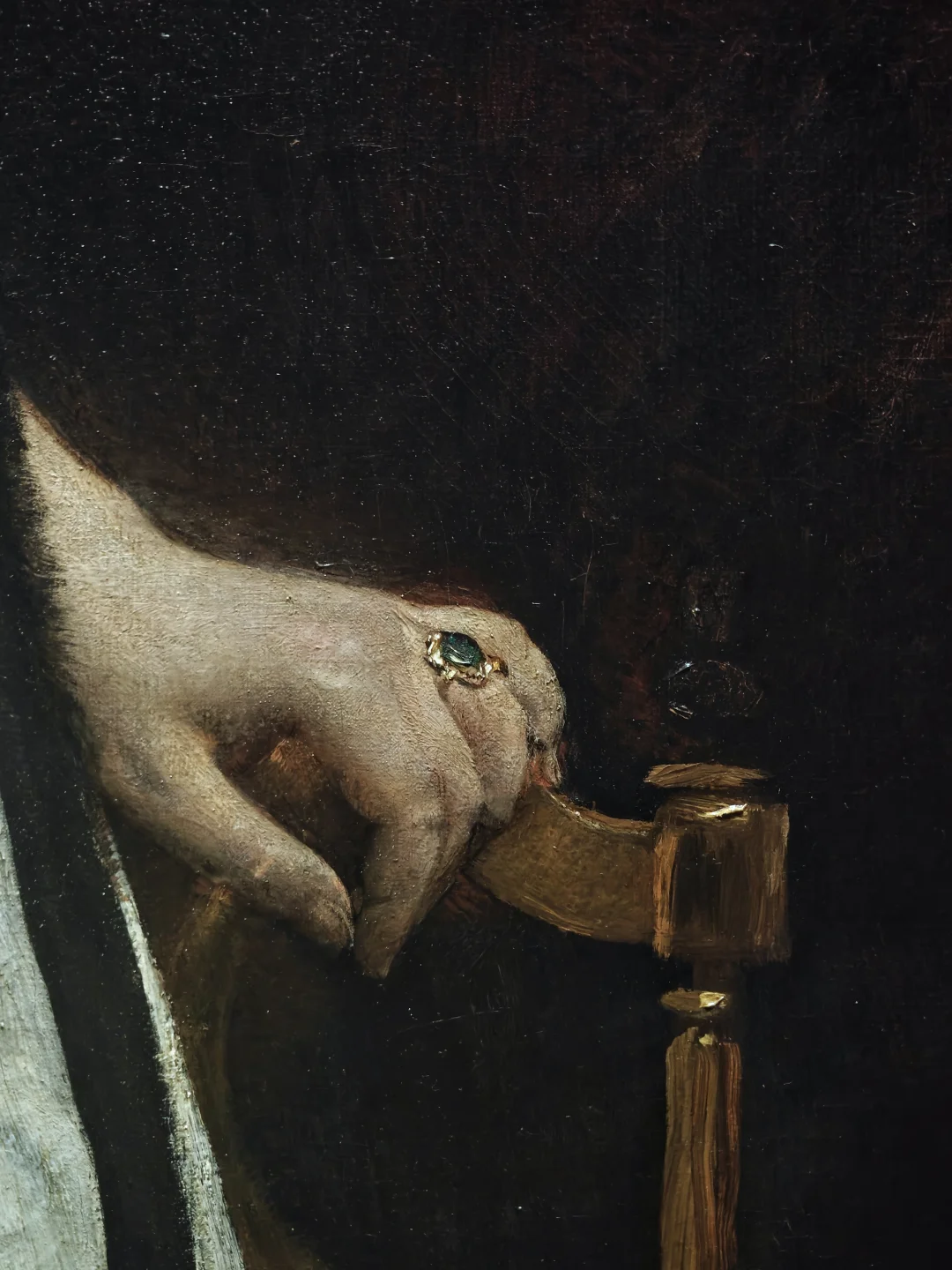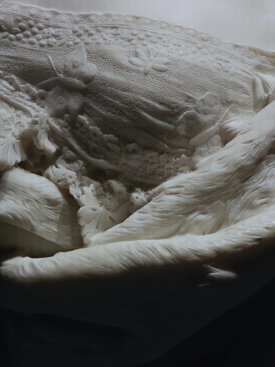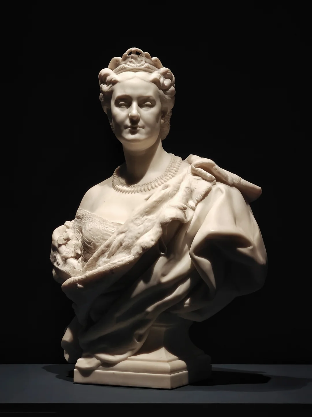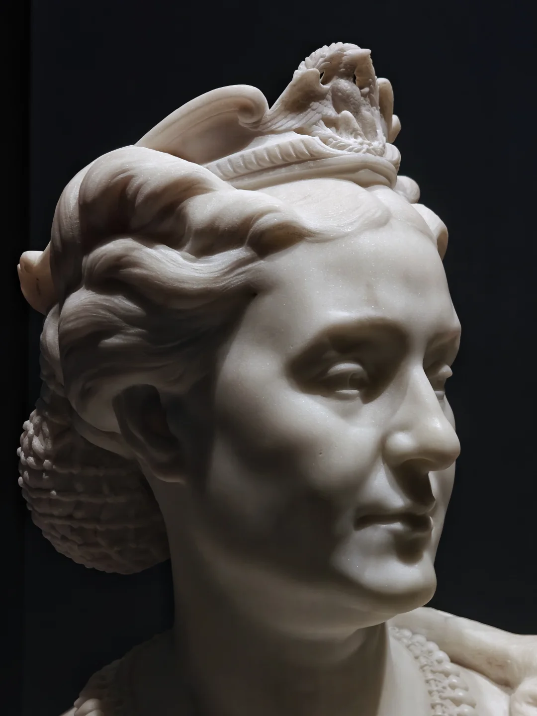卡尔波是浪漫主义雕塑家和画家,与当时许多艺术家的成长路径相似,他也是获得罗马大奖头奖后赴意大利学习,汲取了文艺复兴和巴洛克风格的特点运用到自己的创作中。他与拿破仑三世时期皇室关系密切,这尊雕像便是拿破仑三世的侄女。她是一名艺术家、收藏家及慈善家,成长于被誉为“布满雕塑、画廊及花草之城”的佛罗伦斯,对艺术及收藏甚具热情。雕像下巴微微侧抬的自信仪态将公主的知性与高贵表现得相当完美,对蕾丝的细节刻画显示了高超的技巧。