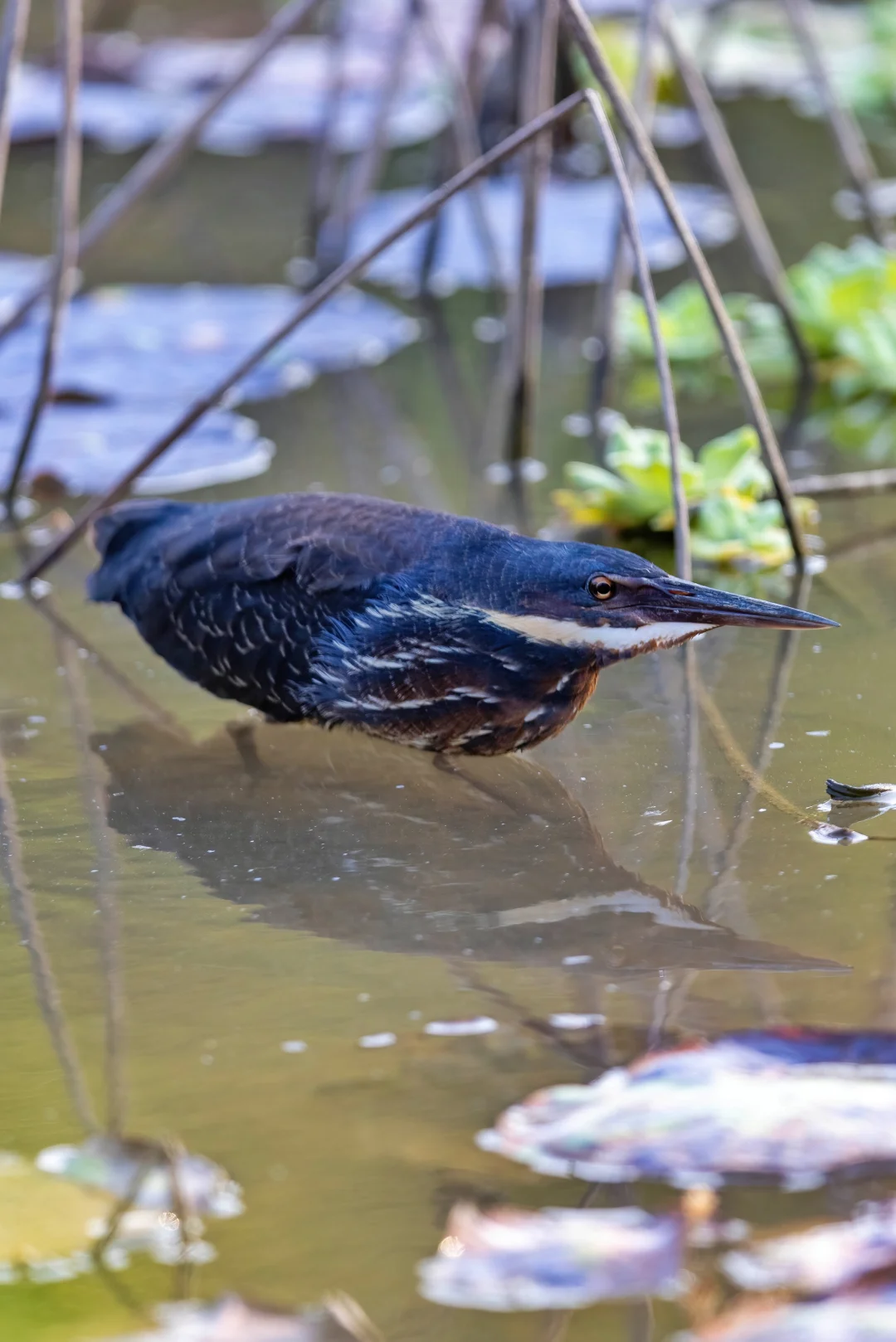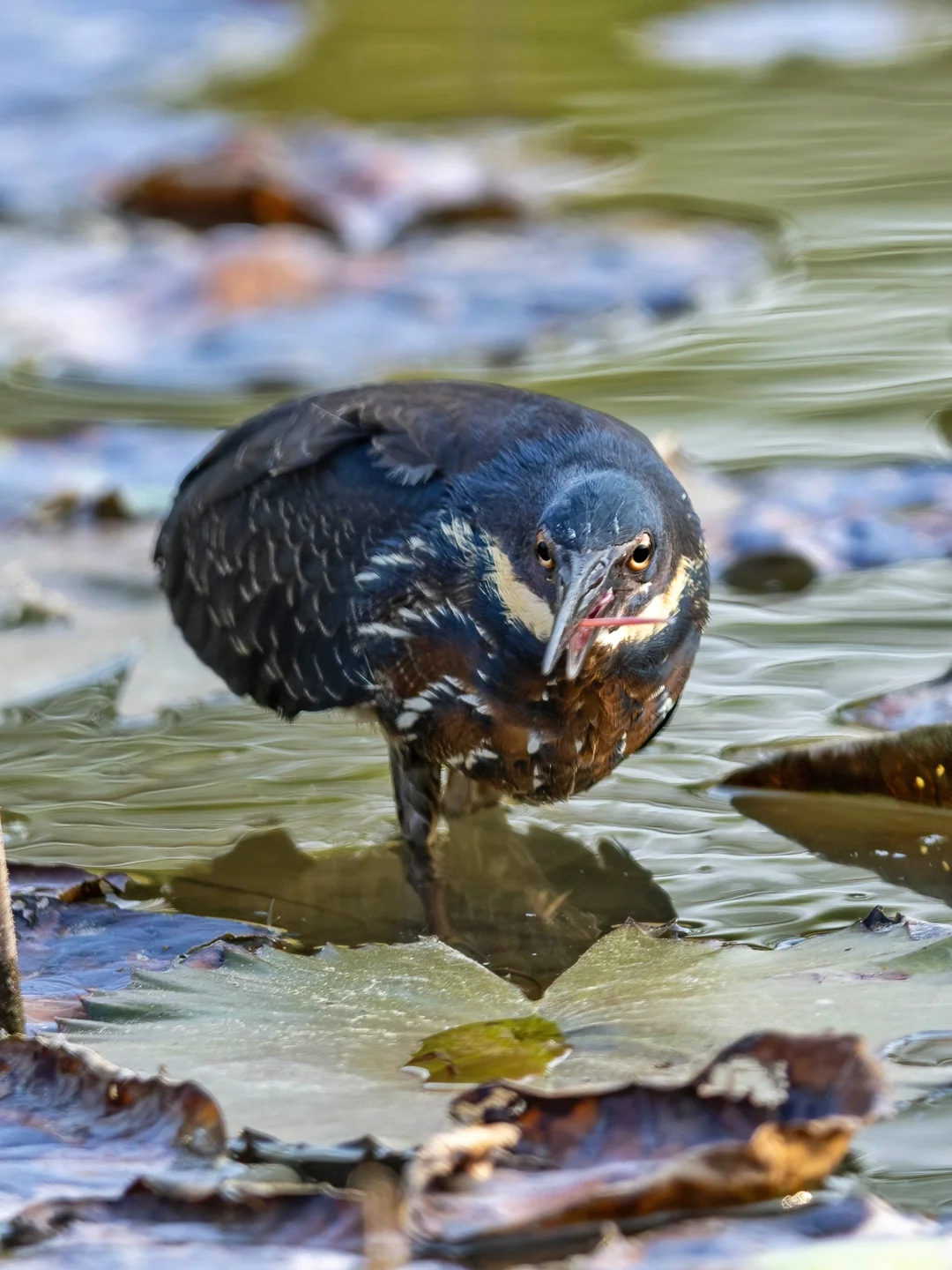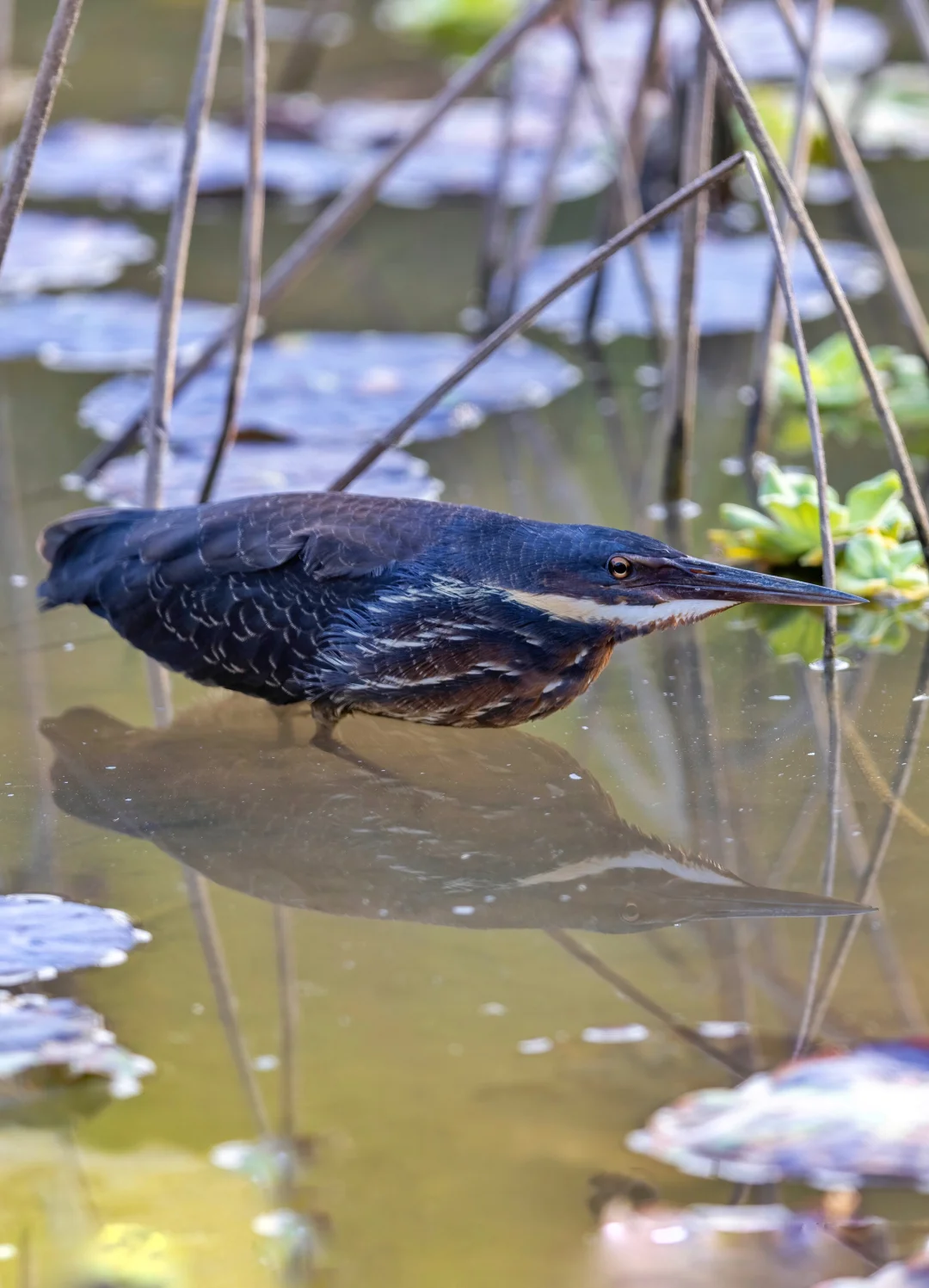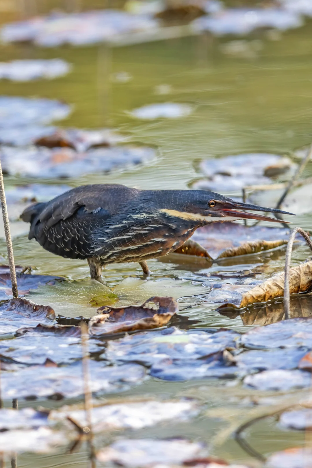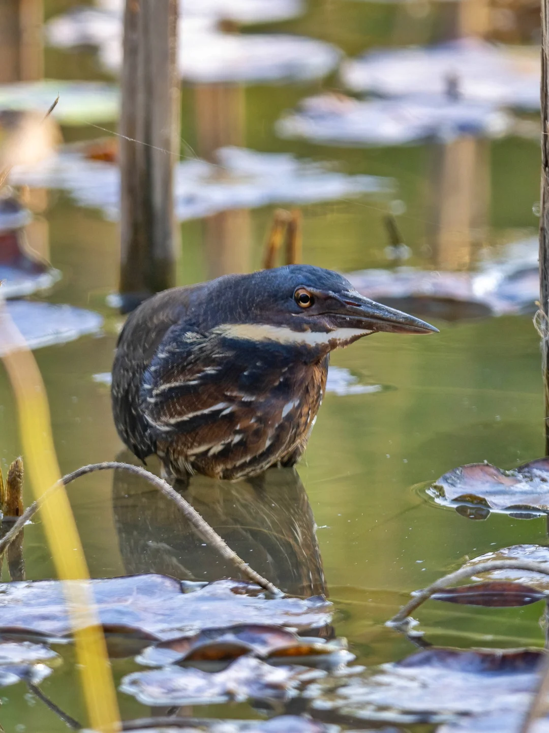 黑鳽是体型最大的苇鳽,颜色也深,上体黑色,颈部两侧黄色,下体布满深褐色条纹。颜色很正,很漂亮热,不过也能非常完美的和环境融为一体,漂亮伪装。它们的瞳孔和栗苇鳽有点相似呈一字型。