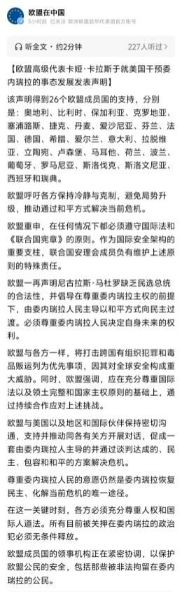 欧盟美女外长卡拉斯在1月5日就美国干预委内瑞拉的事态发展发表了官方声明(内容见图);看了很多遍,终于明白:原来欧盟在乌克兰和委内瑞拉问题上的立场,真的不一样! 1、欧盟将“美军抓捕马杜罗”巧妙变换为“美国干预委内瑞拉”,从而将事件性质由侵略“调整”为干预。 2、这次的声明,不是卡拉斯的个人立场,而是26个成员国的一致认定,但是,唯独匈牙利没有出现在支持名单中。 3、欧盟呼吁各方保持冷静与克制,避免局势升级;这个“各方”,当然包括委内瑞拉。 4、欧盟表示,在任何情况下都必须遵守国际法和《联合国宪章》的原则,但只是重申,并没有提出如不遵守的处理方法。 5、欧盟质疑马杜罗民选总统的合法性,这实际上是美国方面提出的理由,欧盟全盘接受并在声明中进行了强调。 6、声明中,没有“侵略”字眼,没有“谴责”“批评”“反对”等字眼,也没有提出释放马杜罗的要求。 一个深刻的体会:欧盟其实也挺会看事说话的!