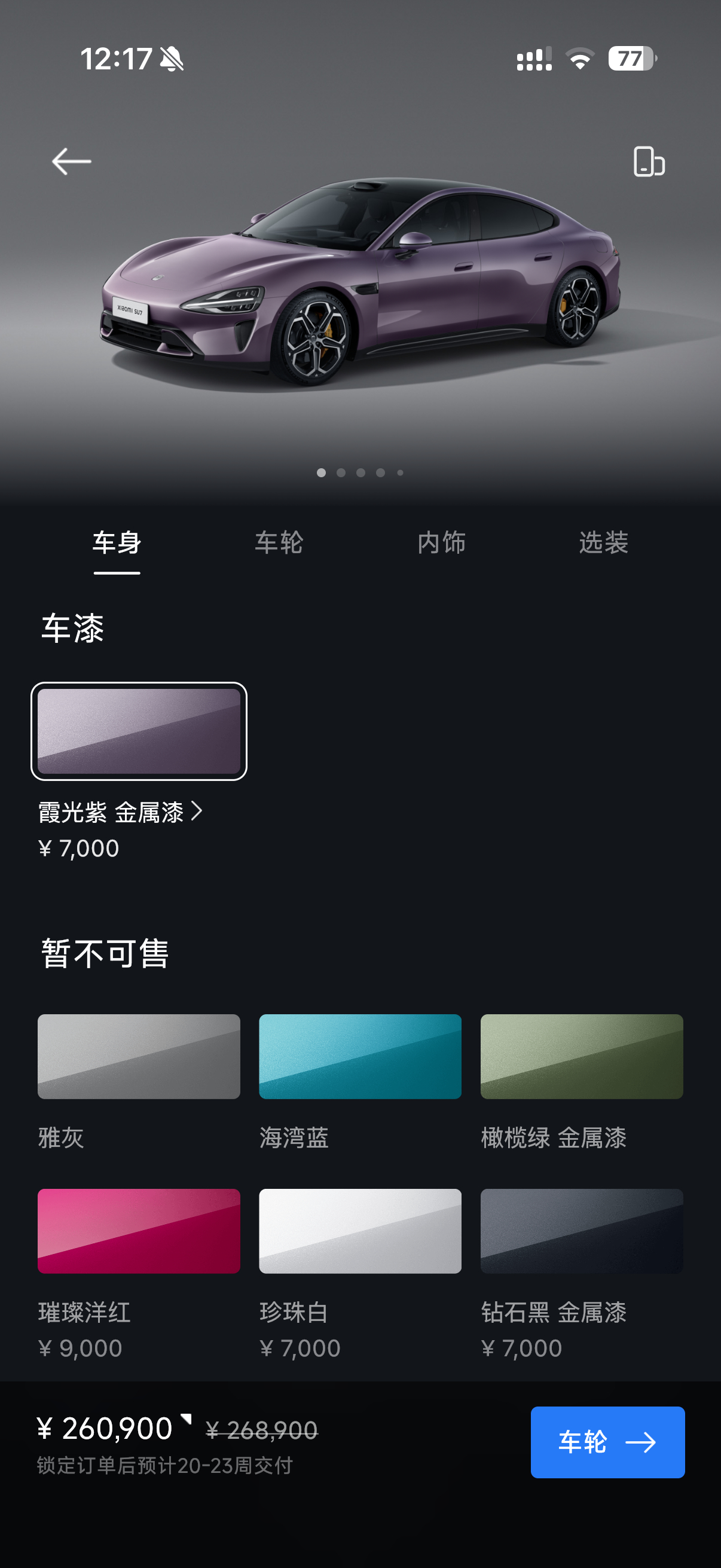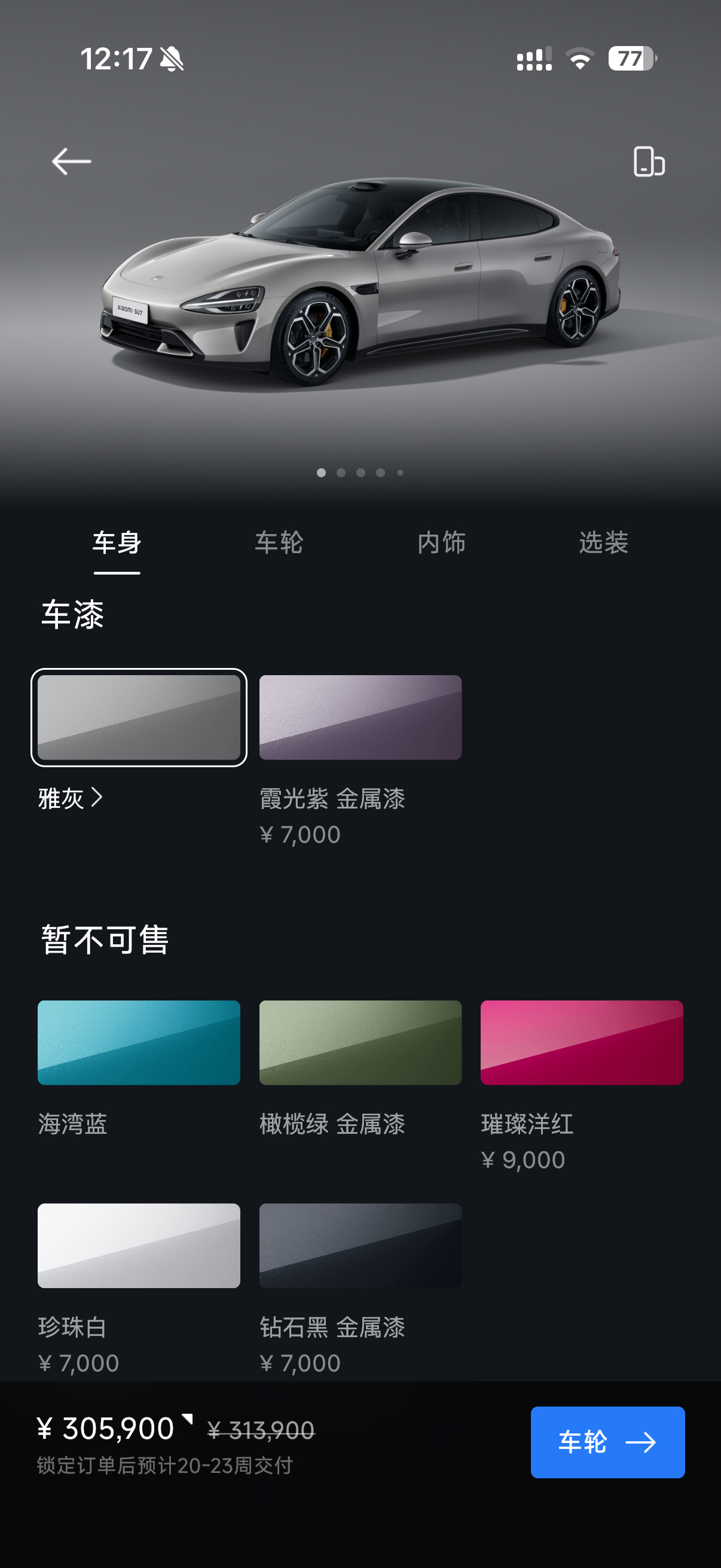 小米 SU7 可选配的车漆颜色变少了其中标准款和 Max 款有灰色和紫色两种颜色,Pro 款只有紫色车漆了。看来离 SU7 改款真的不远了