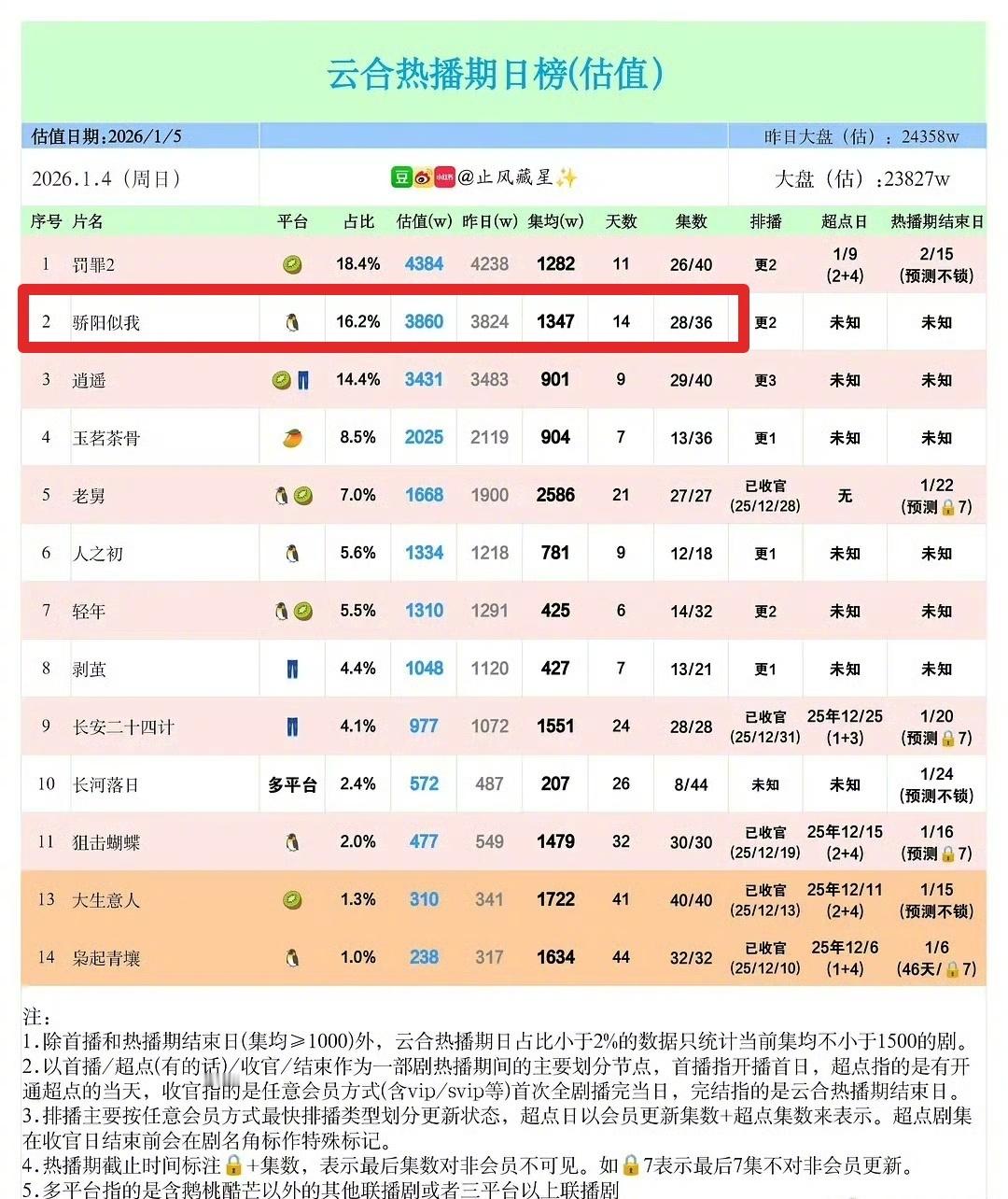 《骄阳似我》🐧站内热度破3w,当日云合3860!这部给2026在🐧播剧的提了个醒:以后大结局前云合3800+、平台热度却没破万的,可以直接锤平台吞热度