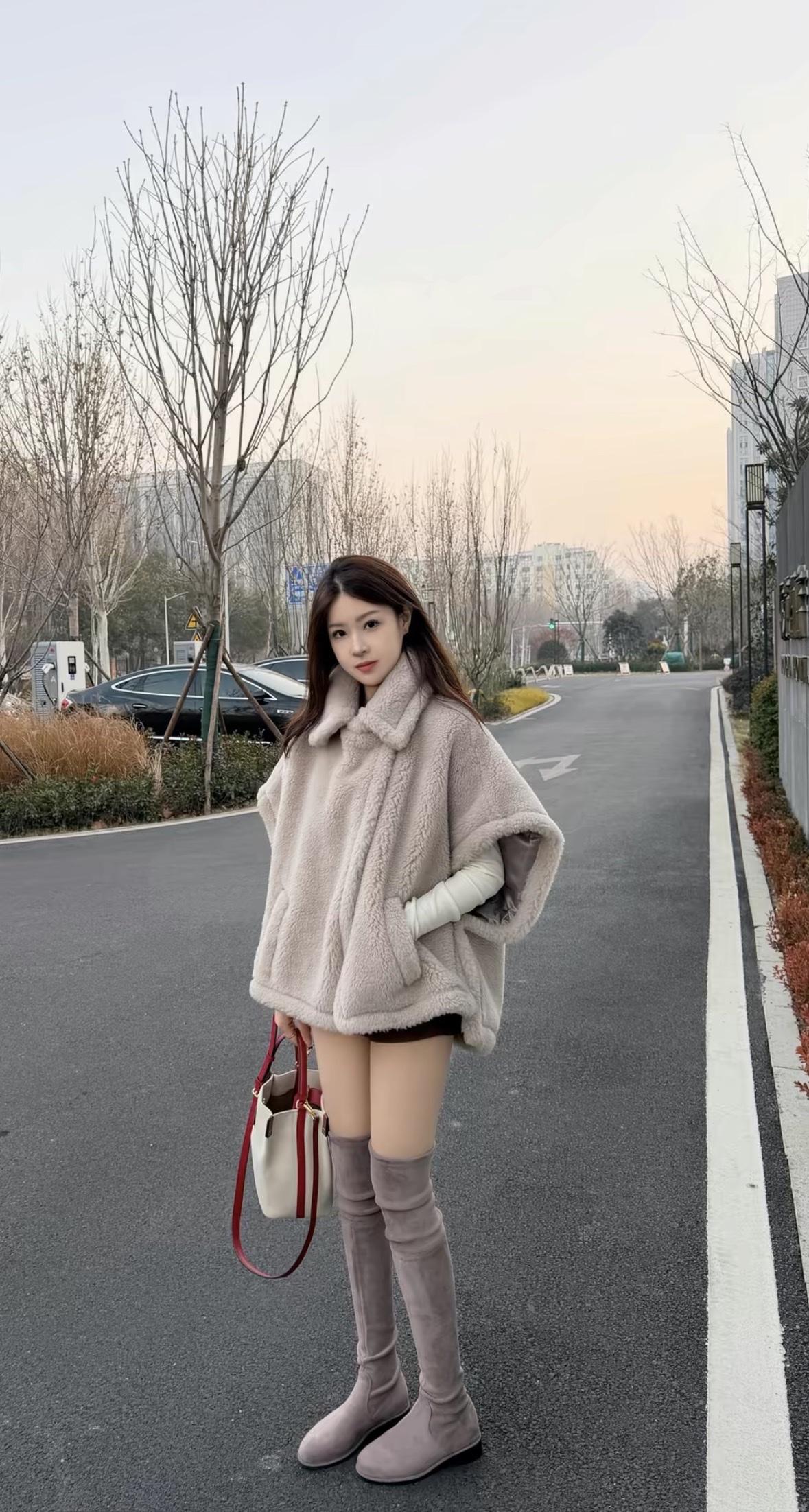 灰色针织衫配短裙,优雅又温柔。