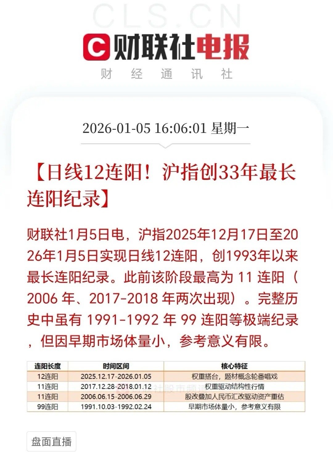 沪指这波操作太猛了!2025年12月17日到2026年1月5日,实现日线12连阳,创下1993年以来最长连阳纪录。之前最高也就11连阳,2006年、2017 - 2018年出现过两次。虽说历史上有1991 - 1992年99连阳,但那时候市场体量小,参考意义不大。从历史经验看,连阳意味着多头气势足。现在有人面对前高4034点压力,纠结要不要回避。其实在大趋势向上时,持股待涨或许才是上策,想回避高点,说不定后面得花更高成本追回来。当然,也不是说持有不动,趋势为王下,阶段优调或是主基调。这波沪指连阳,真是给市场添了把火!你认为会最终会止步几连阳?