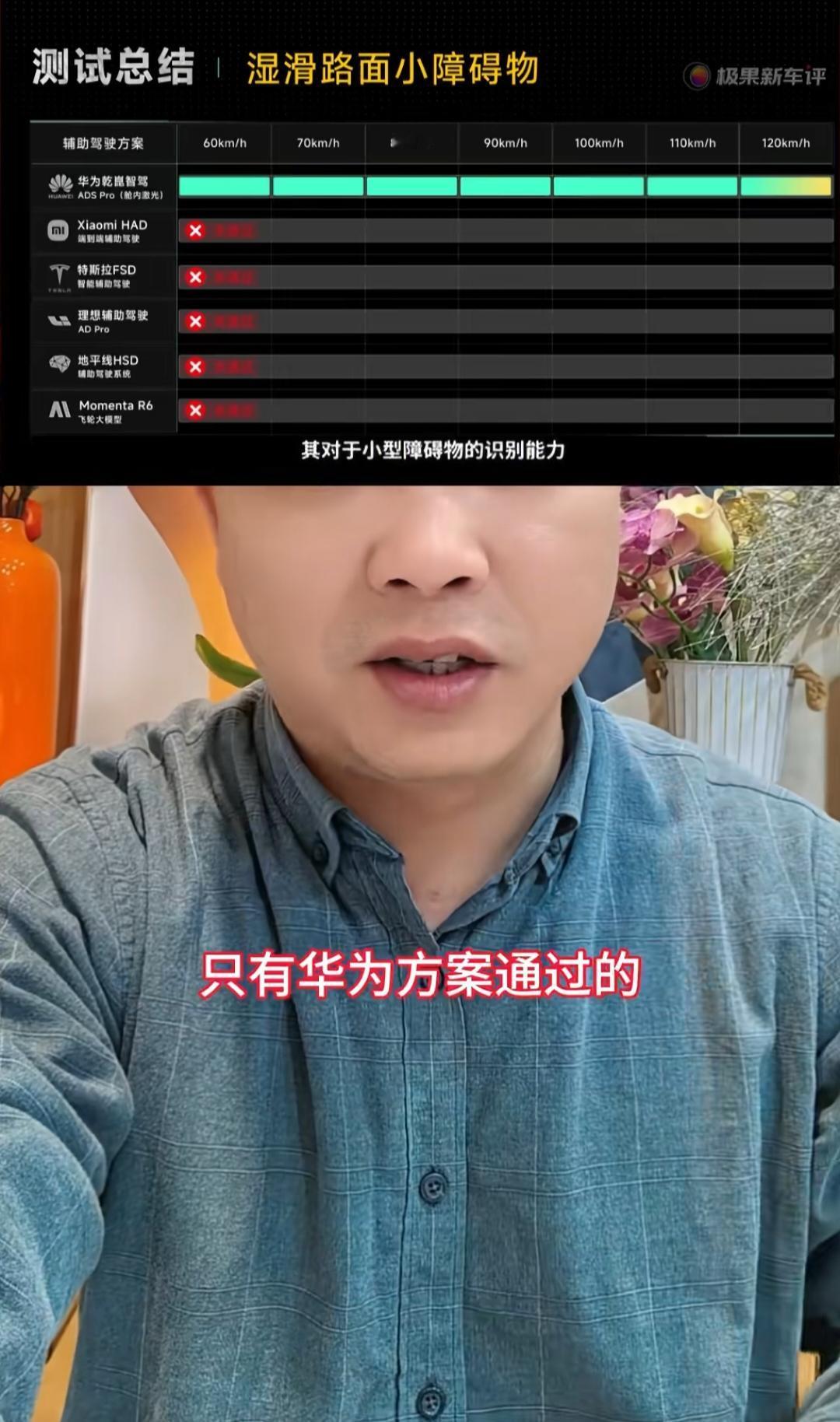 极果新车评1月5日针对国内市场上的6套主流智驾方案开展湿滑路面小障碍物测试,结果只有华为乾崑智驾ADS Pro(舱内激光雷达版本)通过测试(测试结果见下图一),且这一版本还不是华为高阶智驾的Max版本。对此, 从事汽车行业快20年的博主“汽车界老妖”感慨说,很多博主都在吹什么什么品牌的智能驾驶好,但它们连最基本的安全都没做好,安全是智能化的基础,就像一个人,如果他连走路都不会,你说他能跑、会飞,这可能吗? 湿滑路面小障碍物识别与避让测试,属于智能驾驶对路面小型障碍物的感知和应对能力测试范畴,在60km/h至120km/h的全速度区间内,仅华为乾崑智驾ADS Pro(舱内激光雷达版本)通过湿滑路面小障碍物识别测试,小米HAD、特斯拉FSD、理想AD Pro、地平线HSD、Momenta R6等主流智驾方案均未通过。 那么多套智驾方案,却只有华为的通过,而且参与测试的只是华为的舱内激光雷达版本,还不是华为高阶智驾的Max版本。 为此,“汽车界老妖”感慨说,他很奇怪,为什么会有那么多的消费者会相信连安全都做不好厂商所做出来的智能驾驶。他也提醒2026年想要买车的网友,别偏听偏信谁谁谁厉害,要“因为看见而相信”,而非“因为相信而看见”。毕竟,不会走路的绝对飞不了。华为智驾 智驾对比 华为智驾版车 智驾测评