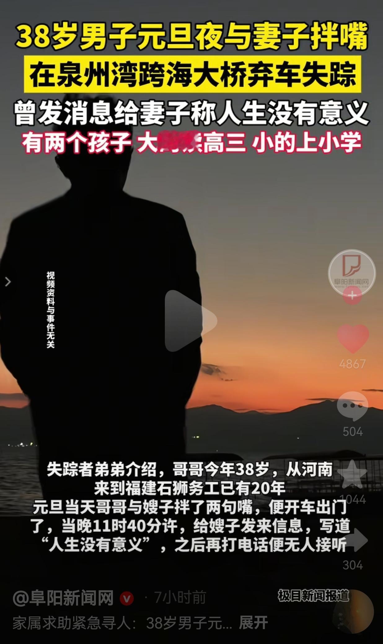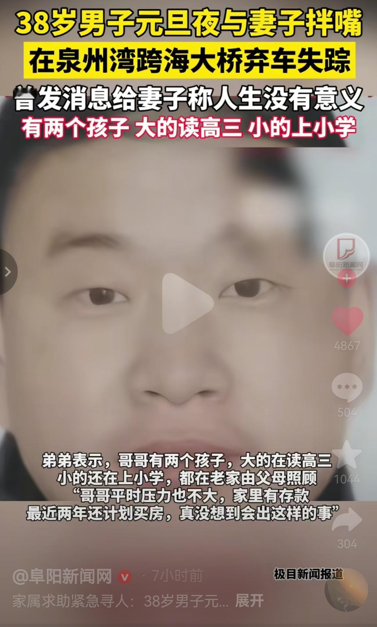 太令人唏嘘了!38岁男子在元旦夜与妻子拌嘴,后一个人开车来到泉州湾跨海大桥弃车失踪,他在失踪之前,曾给妻子发消息称人生没有意义。网友:希望男子没有出现意外吧! 1月4日,有网友在社交媒体平台发布紧急求助信息,发信息者为其弟弟,弟弟表示:自己的哥哥于1月1日晚11时许,在福建泉州湾跨海大桥的应急道车道弃车失踪。 据悉,汽车打着双闪,车内物品并没有丢失,唯独人没有了踪影。 弟弟介绍,哥哥38岁,从河南来到福建石狮务工已有20年。 哥哥失踪的原因是:元旦当天,哥哥与嫂子拌了两句嘴,生气之余,便开车出门了,当晚11时40许,哥哥给嫂子发来了一条消息这个消息是“人生没有意义。” 意识到不对劲的嫂子,赶紧给丈夫打电话,可惜的是,电话始终无人接听。 弟弟还说:哥哥有两个孩子,老大在上高三,老二还在上小学,孩子由父母照顾。而且,哥哥的压力也不是很大,家里有存款,最近两年还计划买房呢?真没想到会出现这种事情。 1月5日,当地派出所工作人员向记者证实了此事,并表示失联男子的妻子,正在派出所等候消息。 网友看到后评论说:“谁的生活不是一地鸡毛呢?我也有个消失的想法,可一想到自己的父母和孩子,以后没有人照顾,所有委屈也只能往肚里吞。” 还有的网友说:“拌两句嘴,只是压死他身上最后一棵稻草吧!” 太傻了!为什么要轻生呢?我们常说:“好死不如赖活着。”活着才有希望,死了,那可是一切都没有了! 他说:“人生没有意义!”你告诉我,谁的人生有意义呢?活着不就是一日三餐,吃喝拉撒睡,然后,把生你的赡养好,把你生的养大成人。 其实,大部分人的人生过得都没有意义。有些人活着已经使出了全身的力量,而有些人一出生就超过了很多人,还有一些人,还在向疾病作斗争呢? 所以说,你能健健康康地活着,手头还有富余,就超过了很多人了,不要冲动,也不要想不开。跟媳妇吵架,心情难过,就到处走走,发泄一下,喝点酒,第二天又是一条好汉。 希望所有的人,都能想开一点,不要做傻事,更不能轻生,要好好的活着。 信息来源:极目新闻