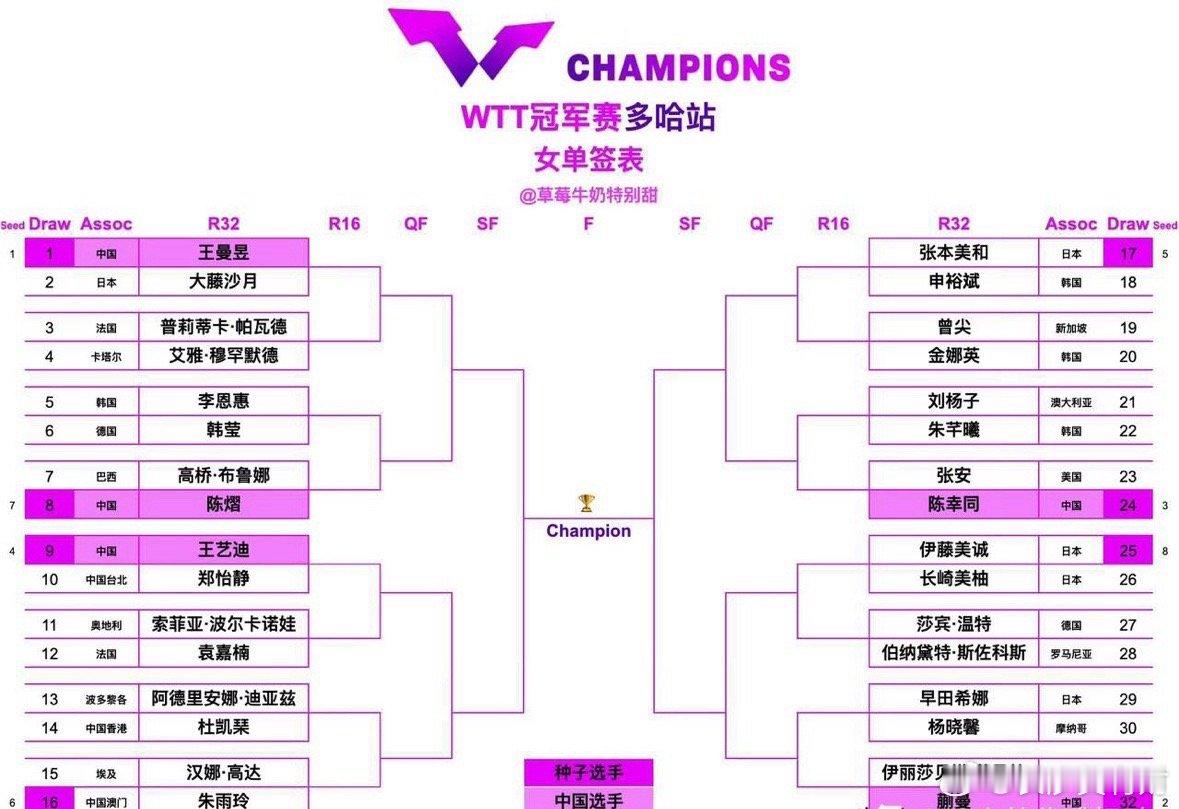 女队抽签仪式结束,总体感觉算上上签。王曼昱和蒯曼各守上下半区,陈熠又和王曼昱分在同一个1/4区,而且首轮又是对阵高桥,这样看对陈熠来说签挺硬。感觉今天女队的签,除王艺迪和朱雨玲有难度,其她都还好。只要女队都能正常发挥,就能顺利锁定四强,女单冠军就是中国队。新年伊始首场冠军赛,期待女队都能全力以赴,打出气势和实力,为国乒开门大吉,首秀一切顺利。