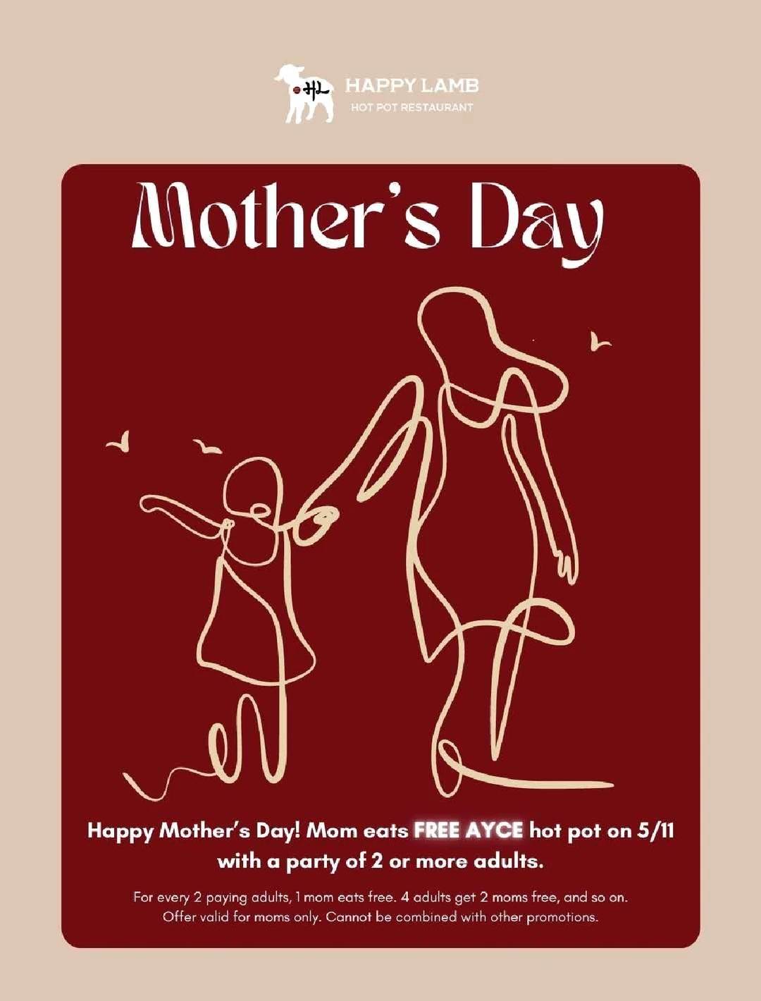 母亲节(5月11日)妈妈免费吃火锅自助,需一名付费成人同行