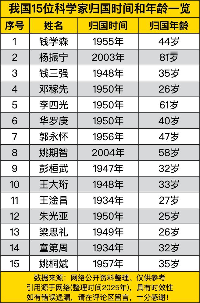 钱学森,在1955年,44岁的时候毅然回来。那可是放弃了国外大把的优渥条件呐,就为了给祖国添砖加瓦。想想那时候国内的情况,可他毫无畏惧,就像一颗超级火种,带着先进的知识和技术,照亮祖国科研的路。 再看邓稼先,才26岁就回国了。这么年轻,正是大好青春,在国外说不定能舒舒服服搞研究、赚大钱。但他偏不,一头扎进祖国的怀抱。这一回来,就一头扎进核研究里,隐姓埋名,为咱国家的国防事业立下汗马功劳,简直就是现实版的超级英雄! 还有杨振宁,81岁高龄才回来。别觉得他回来得晚,在人生的暮年,他带着满满的智慧和经验归来。他在学术领域的影响力那是杠杠的,回来后各种交流讲学,给国内的科研氛围又添了一把火,就像给一锅热汤再加了把调料,让咱的科研更有滋味儿! 这些科学家们啊,真是各有各的厉害。有的年轻冲动,凭着一腔热血回来;有的成熟稳重,在合适的时候助力祖国。不管是哪个年纪回来,他们都怀着对祖国深深的爱。他们的故事就像一部部精彩的传奇,激励着咱这些后辈,要努力奋斗,为祖国争光!