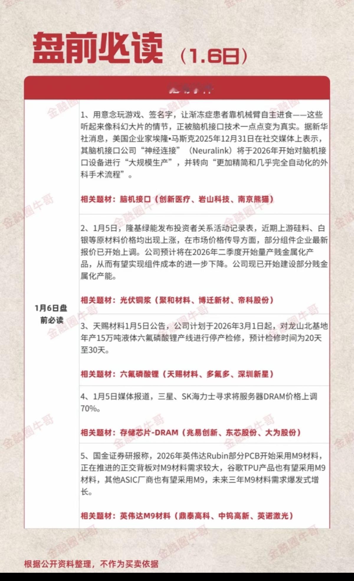 1.6周二 盘前必读! 1.脑机接口 2.光伏铜浆 3.六氟磷酸锂 4.存储芯片DRAM涨价 5.英伟达M9材料