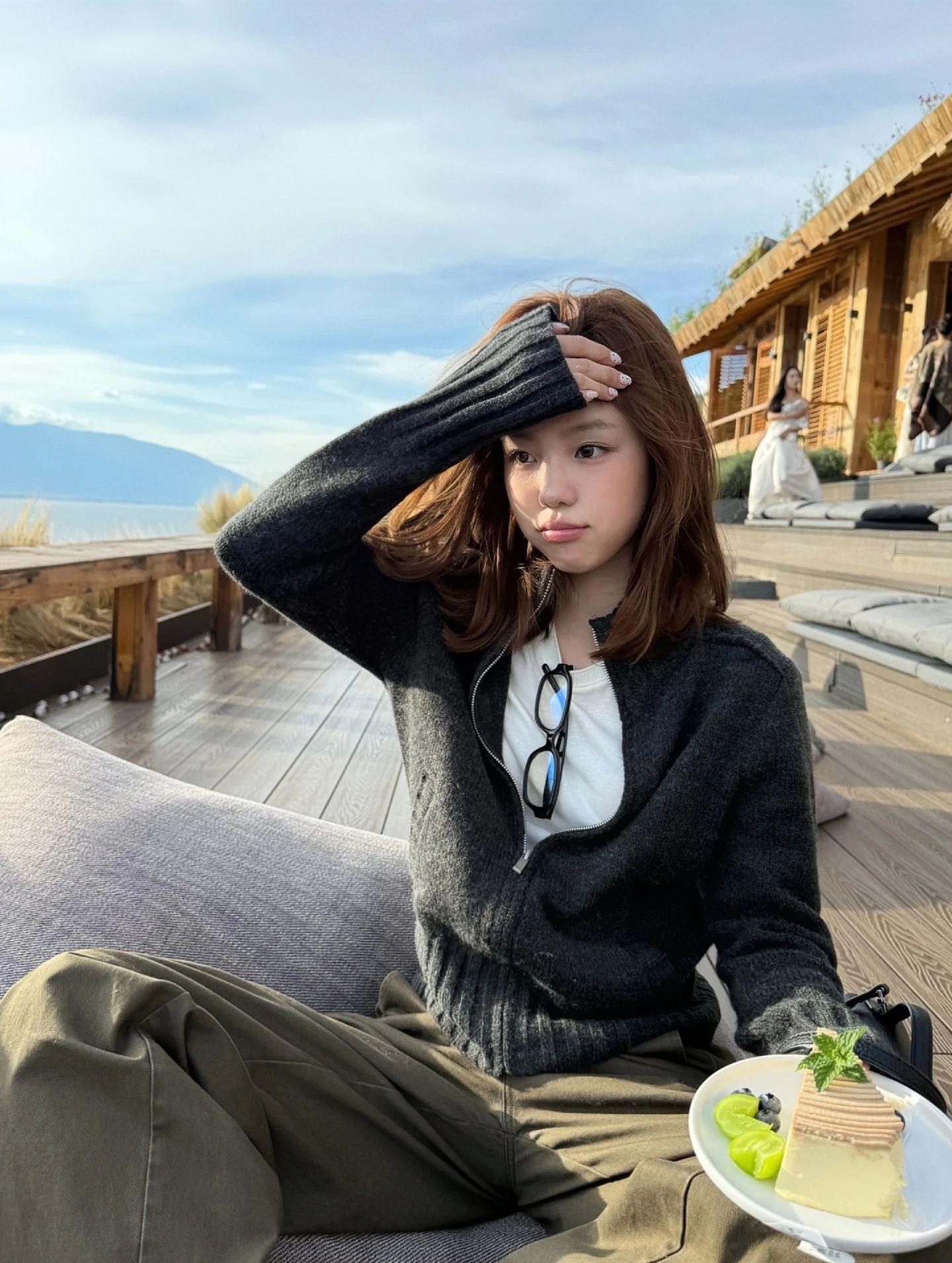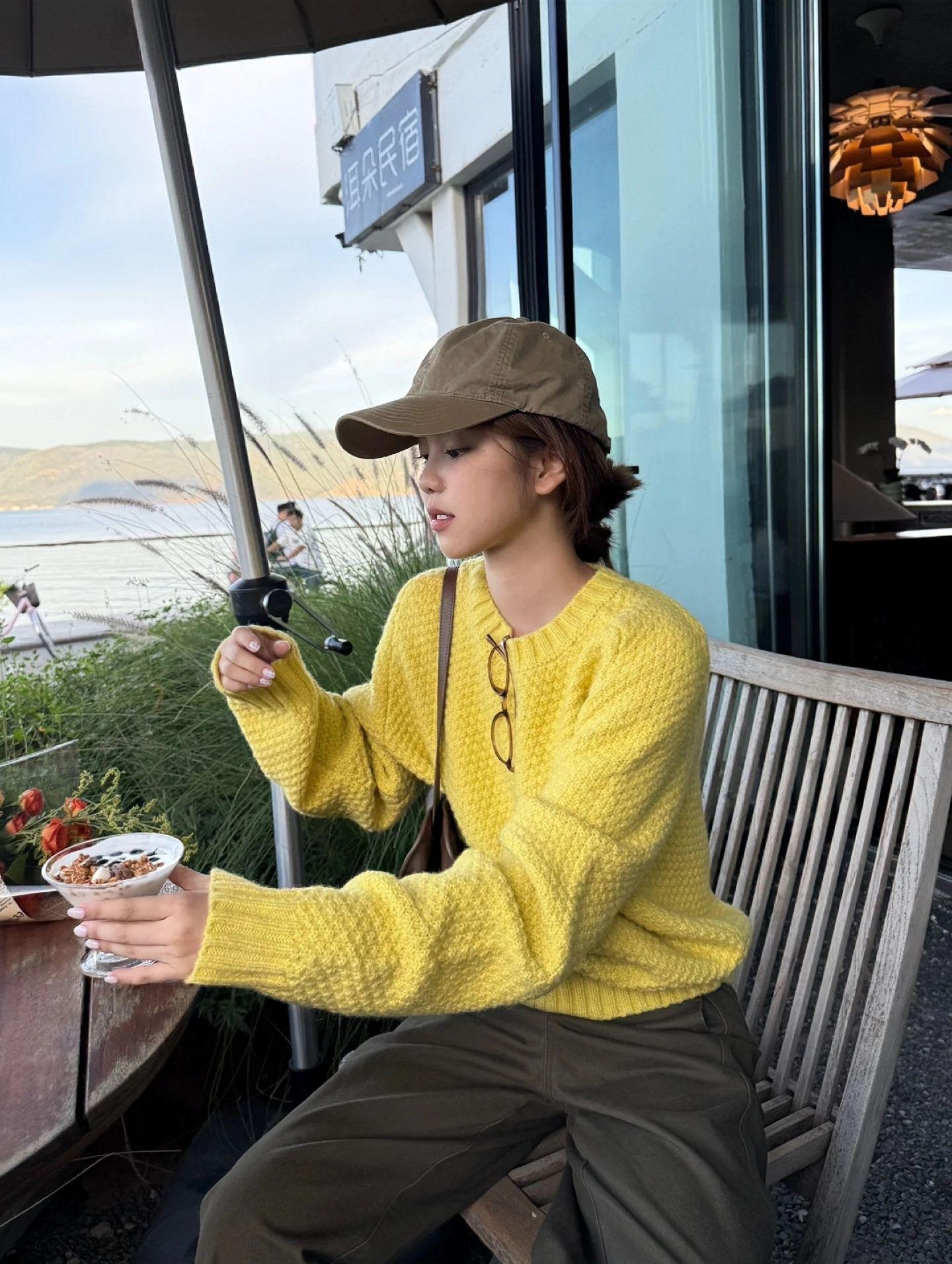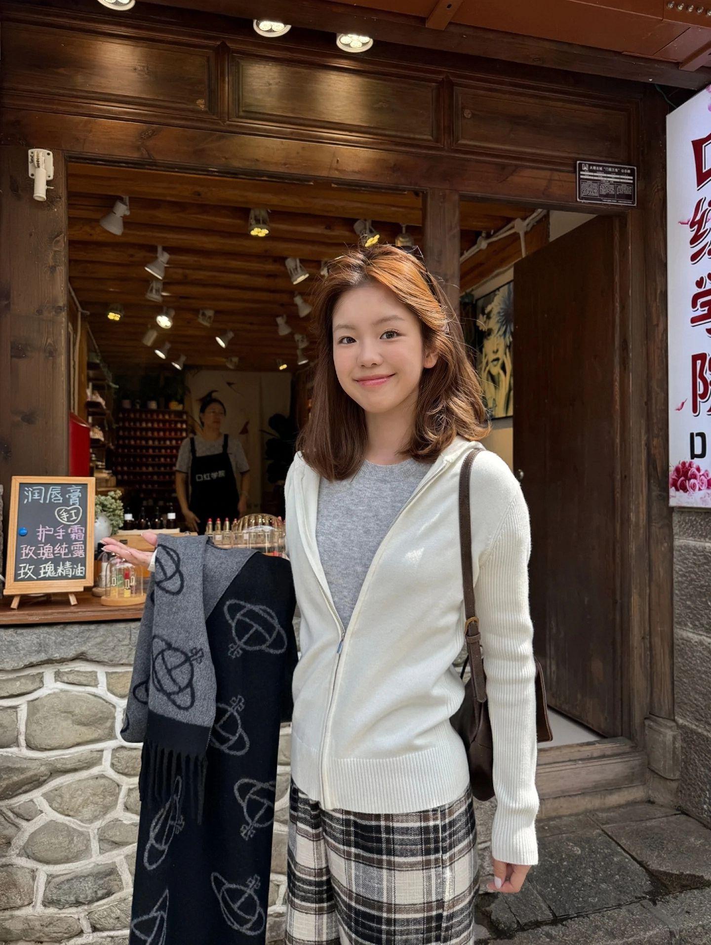 温柔米色连衣裙搭配蕾丝边内搭和针织开衫,简直是优雅气质的代名词!秋季这样穿,时髦