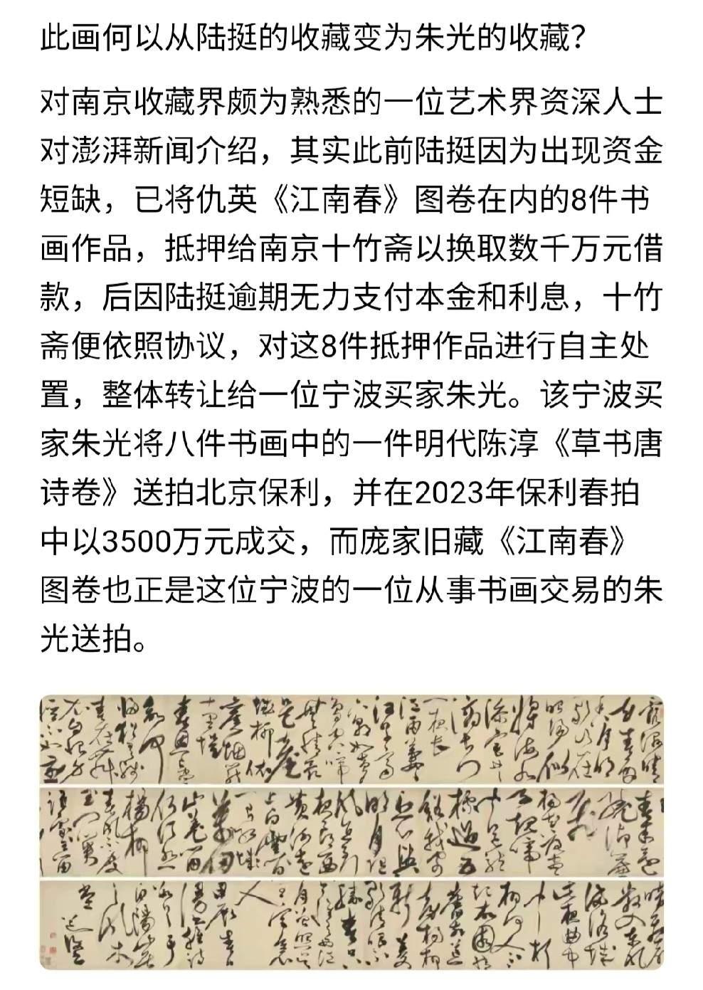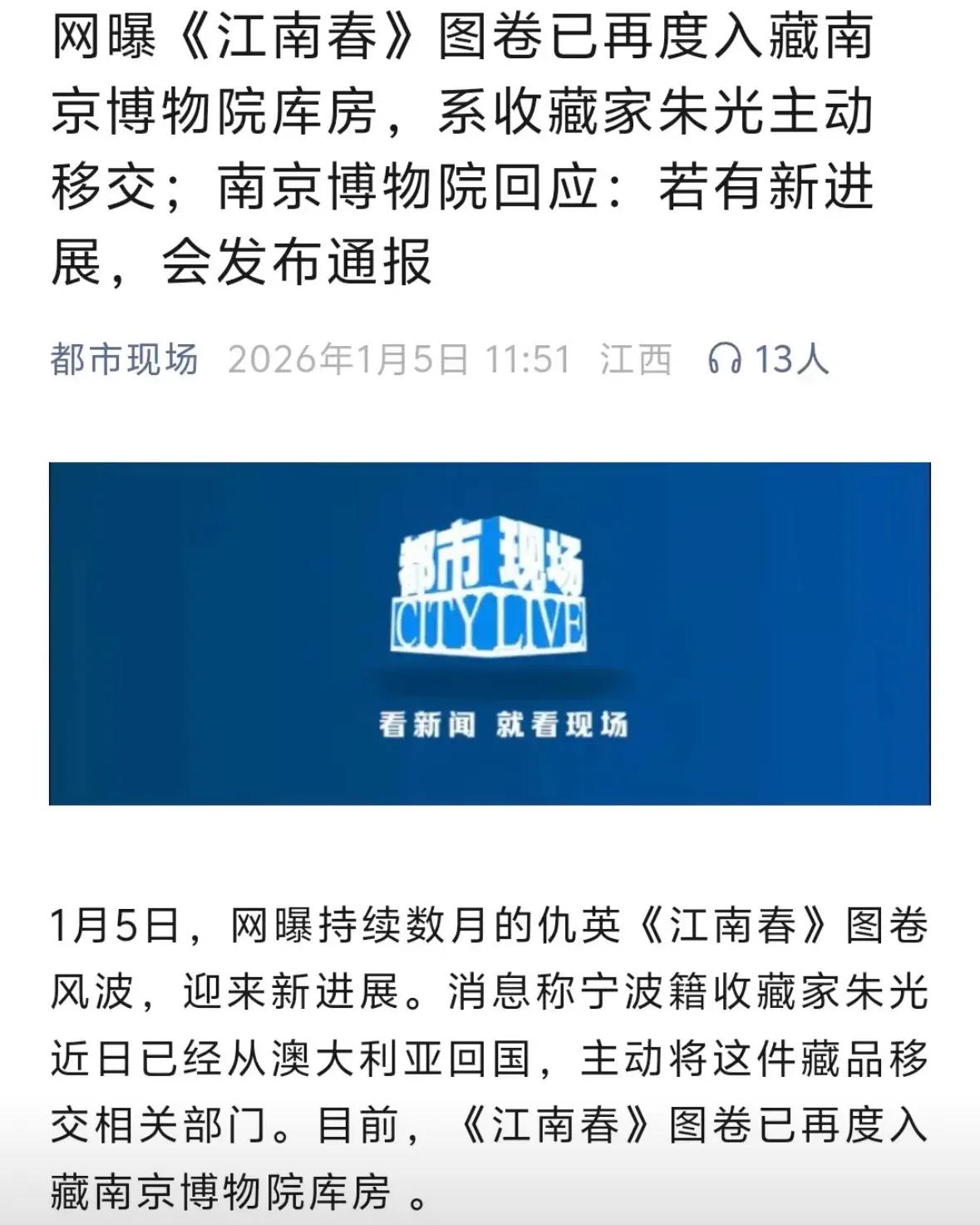 [吃瓜群众]网传《江南春》已经“回归”南博,“收藏家”朱某确实大手笔,评估价8800万,大概率上亿的物件,说“捐”也就“捐”了[思考]但问题的关键,早就不是这张画本身了,稀里糊涂地“去”,“不明不白”地“回”,似乎有些人怕了,急于掩盖什么???既然国家级调查已经启动,就应当有“掀起大案”的决心[尬笑]或许,真应该像网友说的——技术性调查请安徽跨省组建工作组进行,“肥哥” 忍了几十年,等的就是这天[灵光一闪]