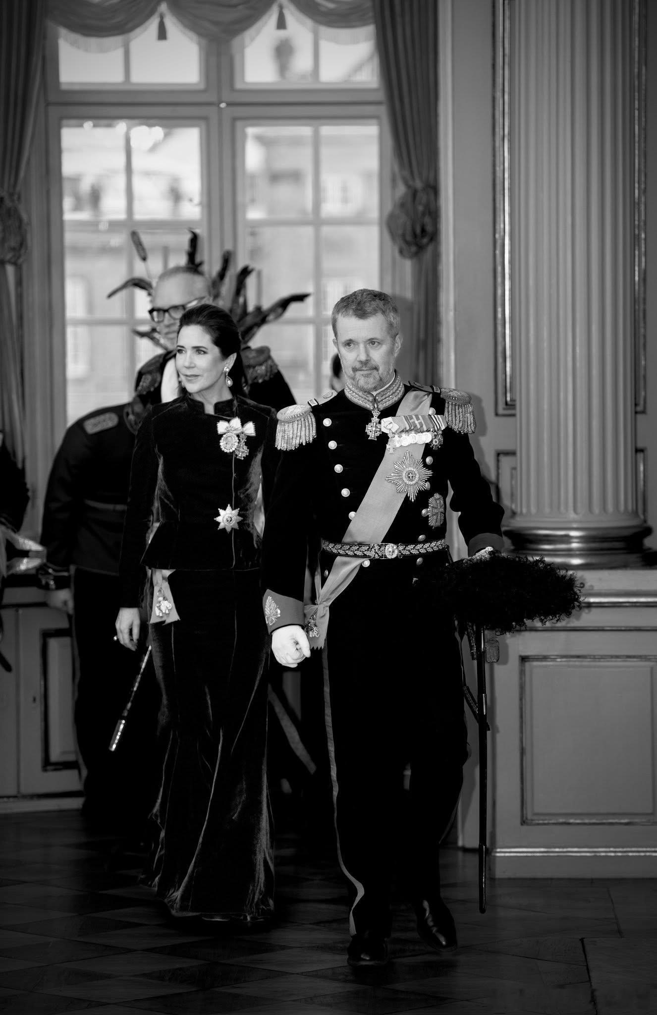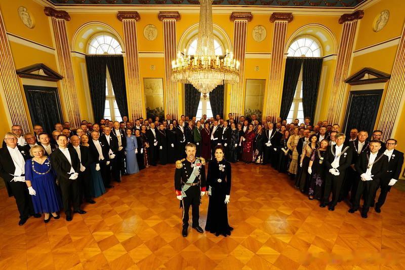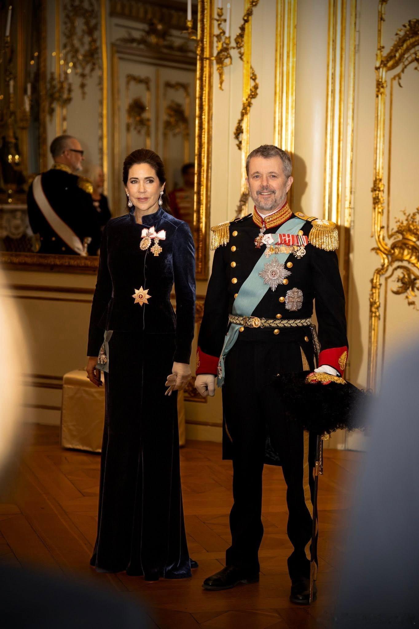 新闻 2026.1.5 丹麦国王夫妇在阿美琳堡宫克里斯蒂安七世宫殿举办第一场新年接待会,主要接待丹麦各地市长和地区议会主席、最高法院以及皇家卫队和皇家骠骑兵卫队军官团,稍后还会有一场面向外交使团的新年接待会,大玛丽的新款深蓝色天鹅绒长礼服不错。