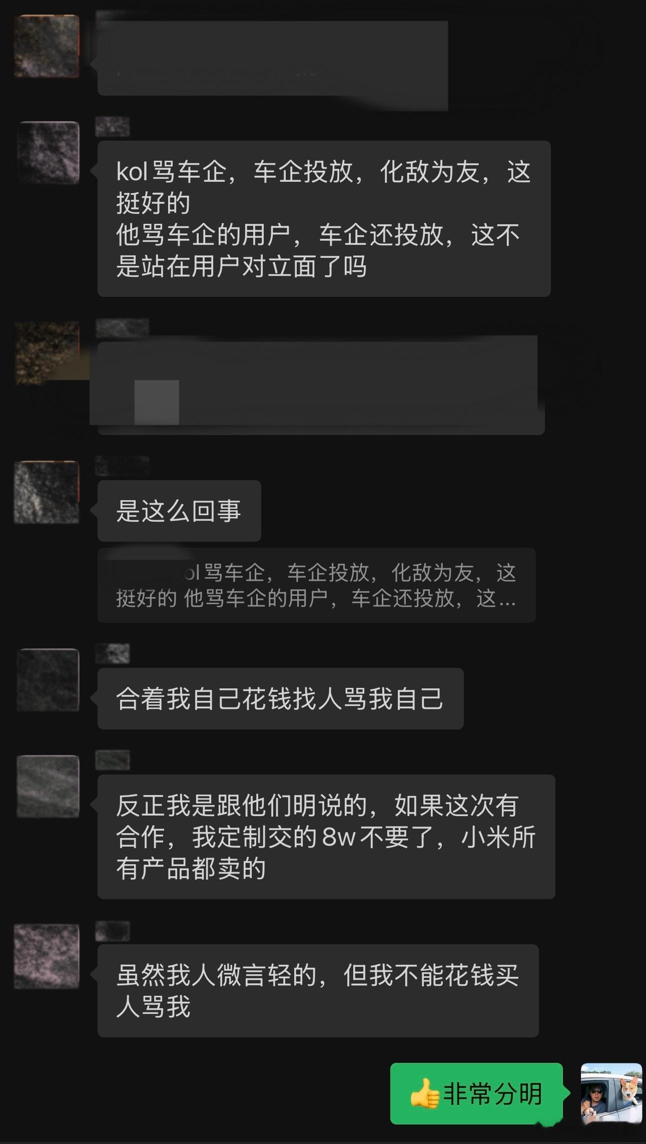 发文图一后,朋友在群里和我聊这个事,我觉得还挺在理的图二,他是小米全系列车主包括 Ultra,现在看来确实是这样,我也说了很多次,用户是用户,品牌是品牌,产品是产品。千万别随意挑战用户的底线小米立即终止与相关KOL合作小米徐洁云致歉小米徐洁云回应团队接触相关KOL