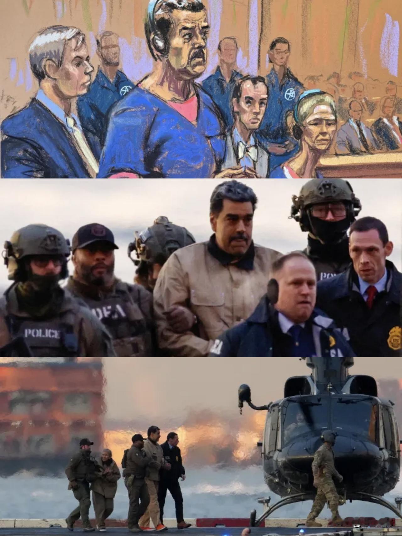 2026年1月5日,在美国纽约市曼哈顿丹尼尔·帕特里克·莫伊尼汉美国法院。 委内瑞拉被俘总统尼古拉斯·马杜罗和他的妻子西莉亚·弗洛雷斯与辩护律师巴里·波拉克和马克·唐纳利一起出席传讯,面对美国联邦指控,包括毒品恐怖主义、共谋、贩毒、洗钱等。 马杜罗称他和妻子在加拉加斯的家中被美军“绑架”,他是一名“战俘”,并对贩毒指控拒不认罪。