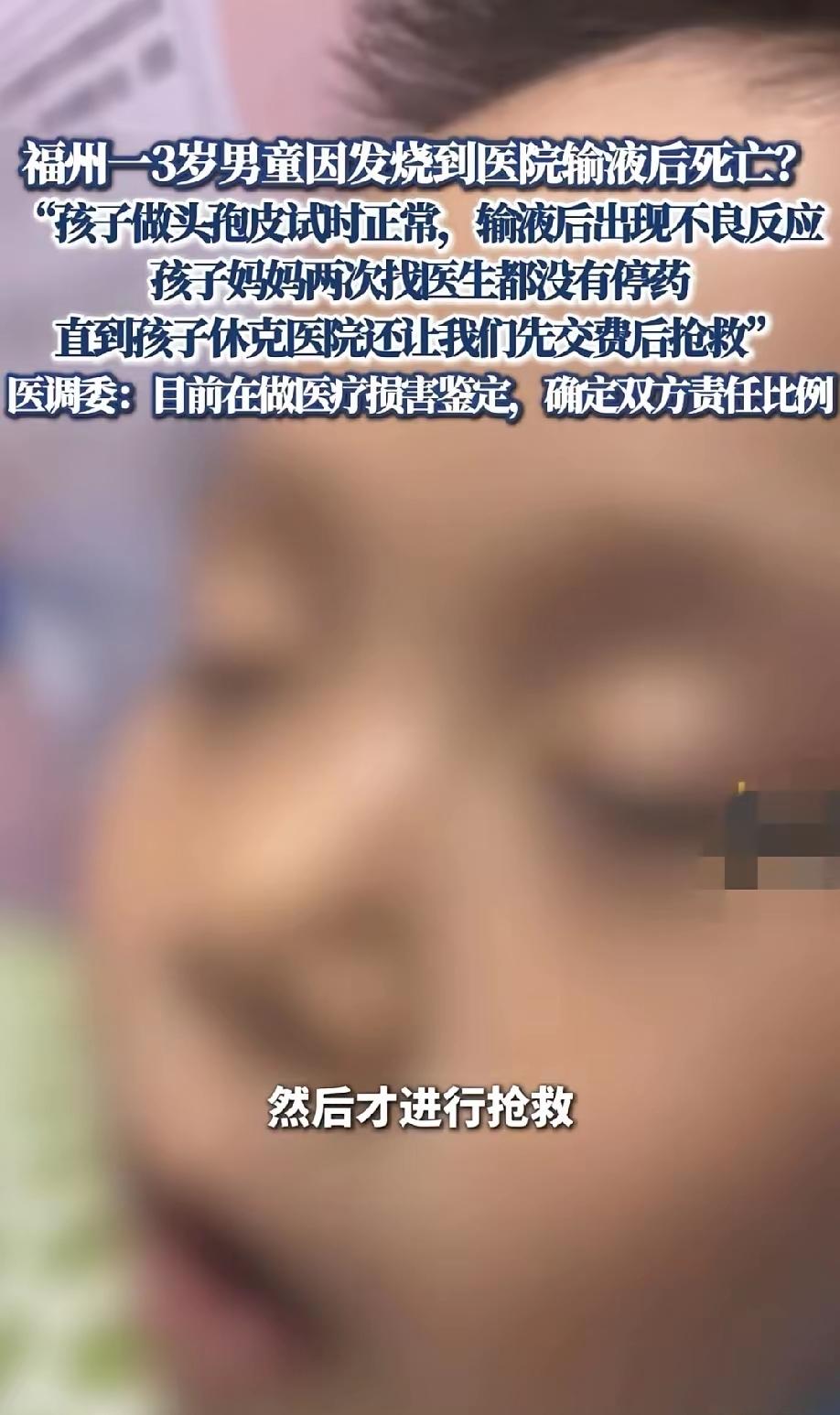 福建3岁男童在医院输液死亡! 头孢皮试明明正常,输液时孩子却突发不良反应。妈妈的心揪成一团,两次慌慌张张找医生反映情况,哭着说孩子不对劲,可医生愣是没当回事,没停药也没采取措施。直到孩子休克昏迷,家长疯了似的求抢救,医院居然还让先交费! 一条鲜活的小生命,就这么没了。这位妈妈午夜梦回,得多恨自己当时没果断拔针啊!可她一个普通人,哪懂什么医学知识,只能听医生的话,这份信任最后却成了剜心的刀。医调委说在做鉴定,可就算分清了责任,孩子也回不来了。 医生的专业判断是底气,可医者仁心才是底线!先交费再救人,这哪里是救死扶伤的地方?生命在金钱面前,难道就这么廉价吗?换作是你遇到这种情况,敢不听医生的话,果断叫停治疗吗?