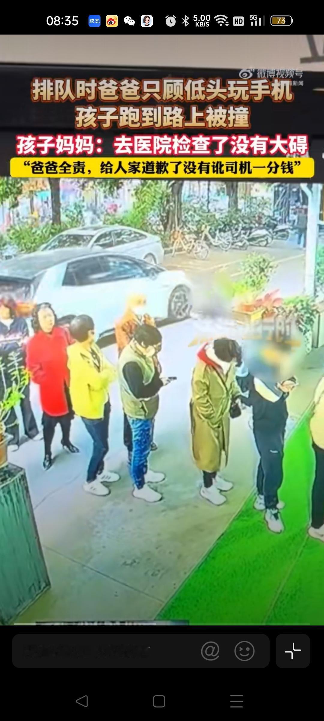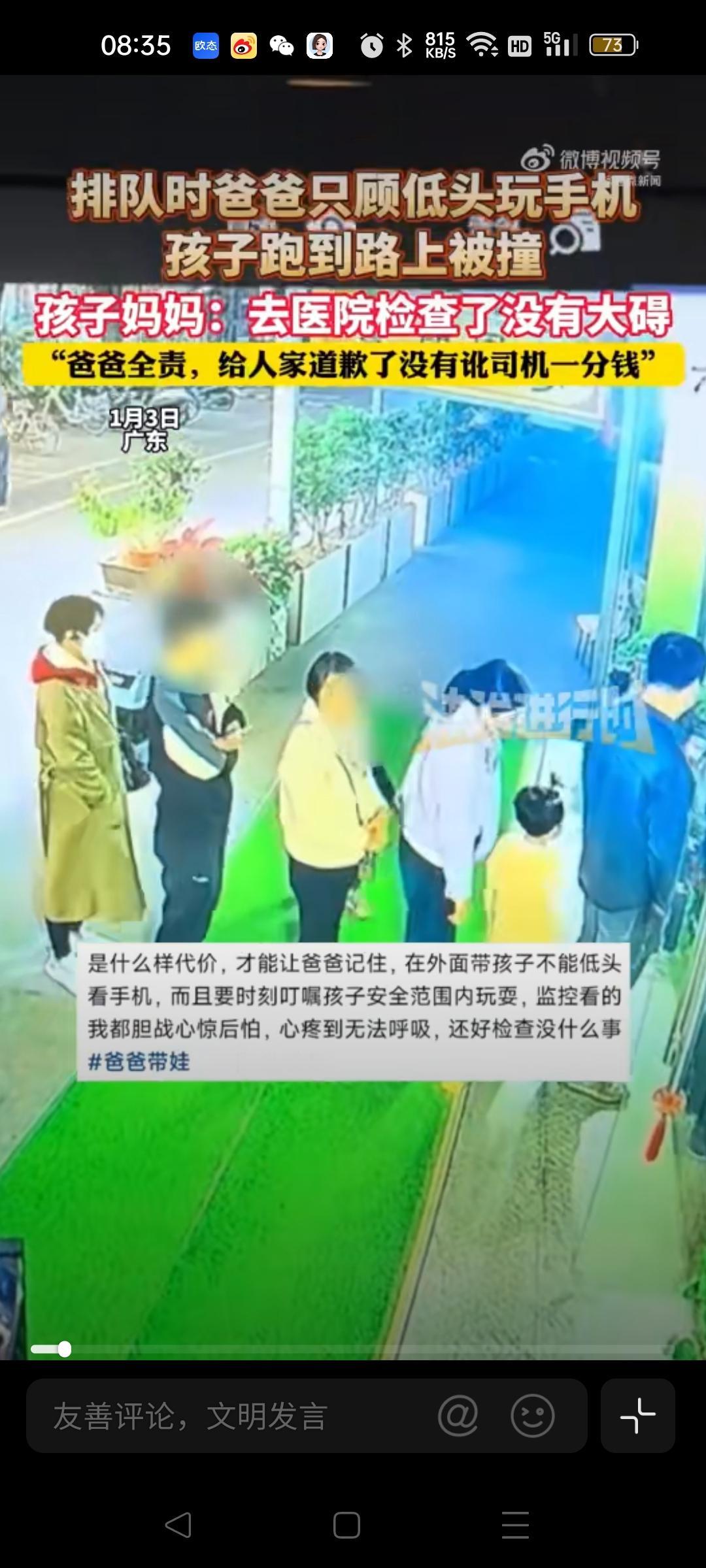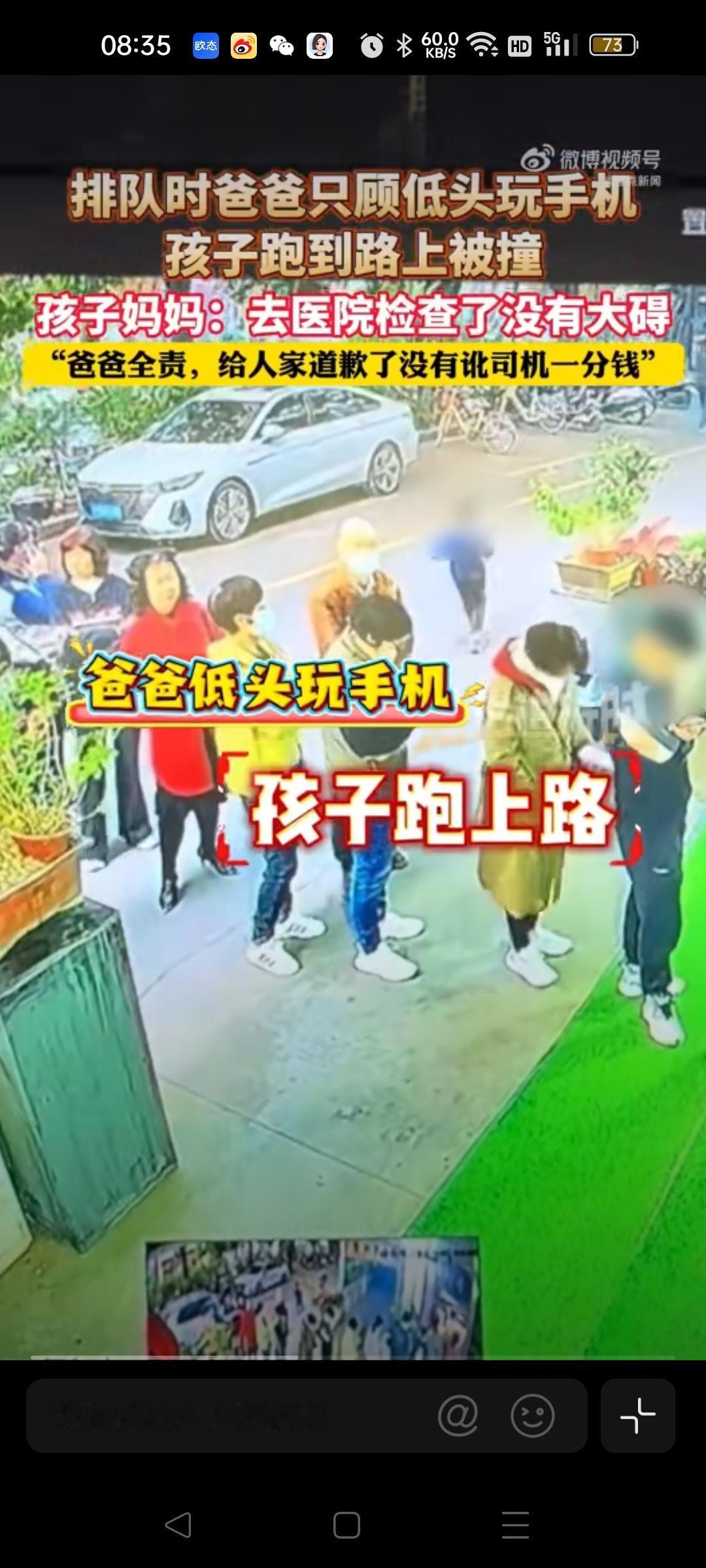 手机莫成“夺命刀”!爸爸沉迷手机,孩子马路遇险给家长上一课 今日热推 家人们,看到“爸爸低头玩手机孩子冲上马路被撞”这条新闻,我的心一下子就揪起来了!这短短一幕,就像一场可怕的噩梦,随时可能在每个有孩子的家庭中上演。谁能想到,爸爸低头看手机的那一小会儿,孩子就独自跑到马路上被车撞倒,简直让人后怕不已。 从人性角度来说,手机已经成为我们生活中不可或缺的“伙伴”。等排队的时候玩会儿手机消遣一下,似乎是再正常不过的事。可就是这看似平常的举动,却隐藏着巨大的安全隐患。我们在享受手机带来的便捷和娱乐时,往往忽略了身边最珍贵的人——孩子。孩子的好奇心和行动力都很强,在没有大人监管的情况下,很容易做出危险的行为。这位爸爸的疏忽,给所有家长敲响了警钟。我们总是以为危险离我们很远,却不知危险可能就在我们低头的瞬间降临。 这件事也让我们看到了这位妈妈的理智和善良。孩子受伤,她没有去讹司机,而是让爸爸承担责任并道歉,这真的很难得。在这个容易冲动和计较的社会里,这样的做法给我们树立了一个好榜样。 生活中,我们不能让手机成为亲子之间的“第三者”。陪伴孩子的时候,就全心全意地投入,别让手机偷走了我们和孩子相处的宝贵时光。 大家在带孩子的时候,有没有因为玩手机而有过类似的惊险时刻呢?你觉得家长应该如何平衡手机和陪伴孩子的关系呢?快来评论区分享你的看法吧社会百态 社会新闻