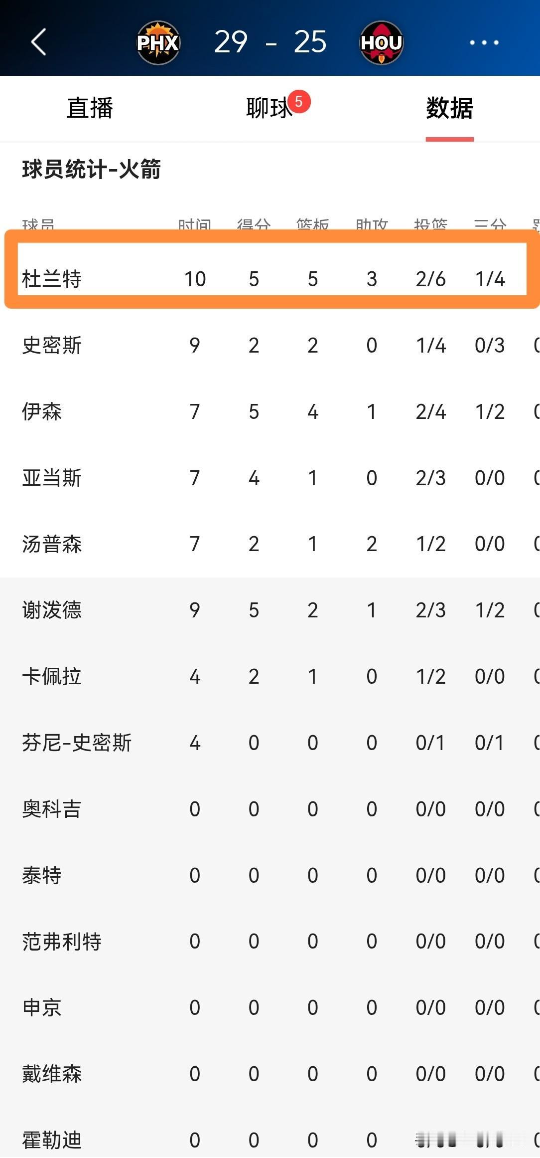 我强烈建议火箭立刻交易走老将杜兰特!在今天火箭主场迎战太阳的比赛中,目前双方的第一节比赛已经结束,火箭以25:29落后于对手。在第一节比赛中,杜兰特的投篮表现非常糟糕,他首发出战10分钟,投篮6中2,其中三分球4中1非常低效的得到5分。 毫不夸张的说,以目前的情况来看,杜兰特是无法带领球队夺冠,火箭要想夺冠必须引进一名处于生涯巅峰期的超级巨星。