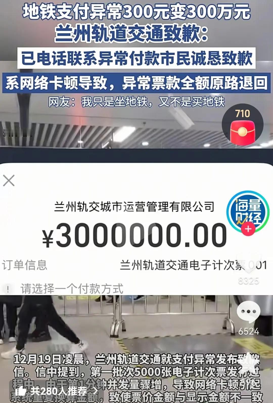 地铁支付异常,300元变成了300万元,这乘客真是心大,但也是真有钱。只是坐地铁,没叫你买地铁啊。