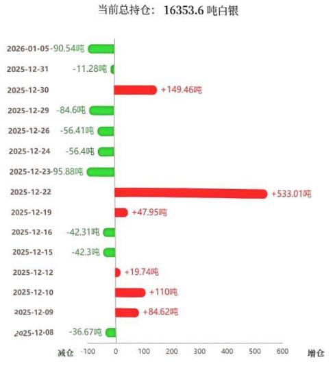 我们知道周一, 国内外白银期货大幅上涨, 纽约白银期货价格飙升5.87%。 那么和其有一定相关性的 白银ETF持仓如何变动? 根据全球最大白银ETF的 iShares Silver Trust公布的数据, 5日持仓较上日减少90.54吨, 当前持仓量为16353.6吨。 这也是近日连续第二次减少, 是否说明白银上方面临一定压力, 相关资金在规避风险?