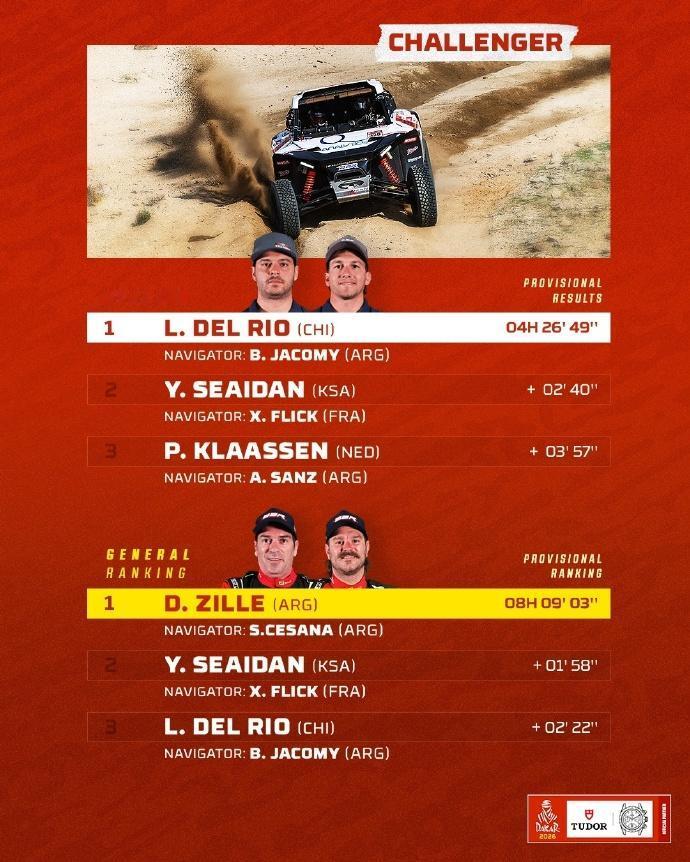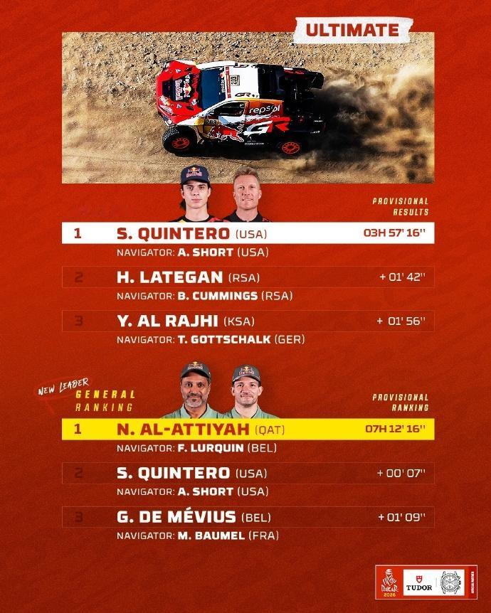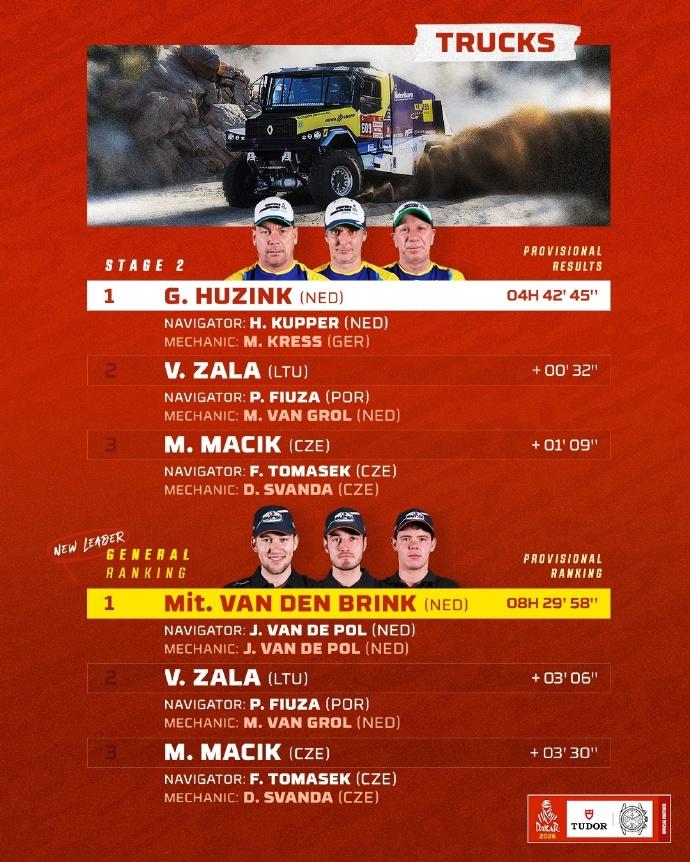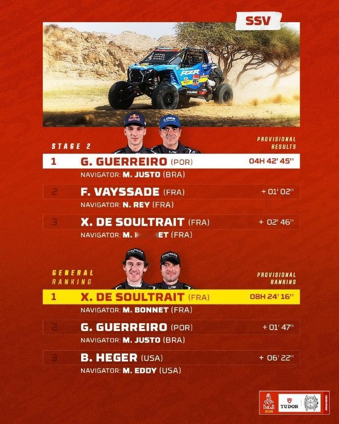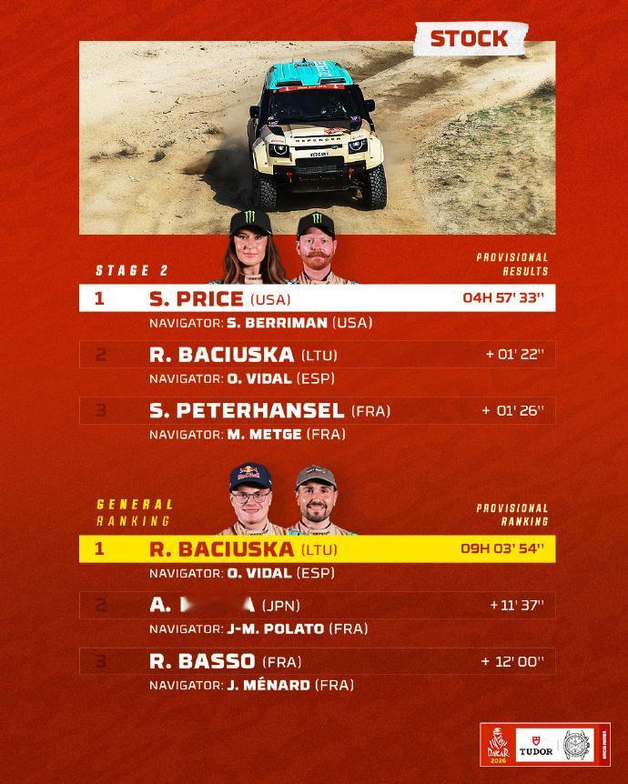 赛车:2026达喀尔第2赛段战报! 北京时间1月5日至次日凌晨,2026达喀尔拉力赛结束第2赛段的争夺。汽车组方面,丰田阵营包揽了今天的前五名,金特罗取得赛段胜利,也是生涯第3次取得赛段冠军,拉特甘卫冕冠军阿尔拉吉分别取得亚军和季军。总成绩方面,阿尔阿提亚以7秒优势领跑。。 摩托车组方面,前三名的争夺依然十分激烈。卫冕冠军桑德斯取得第2赛段胜利,卡奈特和布拉贝克取得二三名。总成绩方面,桑德斯在获得开路时间补偿后,以30秒的优势暂时领先卡奈特。 6个组别TOP3得主👇 🚗 T1组:丰田车手金特罗最快,阿提亚总成绩第一。 丰田车队在第2赛段表现惊人,强势包揽前五名,塞斯·金特罗夺得赛段冠军! 🚘量产T2组:路虎卫士车手萨拉最快,队友罗卡斯领跑总成绩。 🏍️摩托车组:桑德斯最快,并领跑总成绩。 中国军团: 凯越车手苏尼尔获得赛段第47 ,领跑中国军团两两轮组; 韩魏在SS2赛段的比赛中,遭遇两次爆胎,让他损失了大量的时间,最终位列SS2赛段T1+组的第36名,其中第二次是在高速路段爆胎。在坚持到换胎区后,又因后勤卡车被堵在路上,轮胎没到再次损失时间; 九江车队的243号车手鹿丙龙,在SS2赛段的比赛中,排名T1+组的第27位。总成绩方面,紧随同队的范高翔,排名第28。