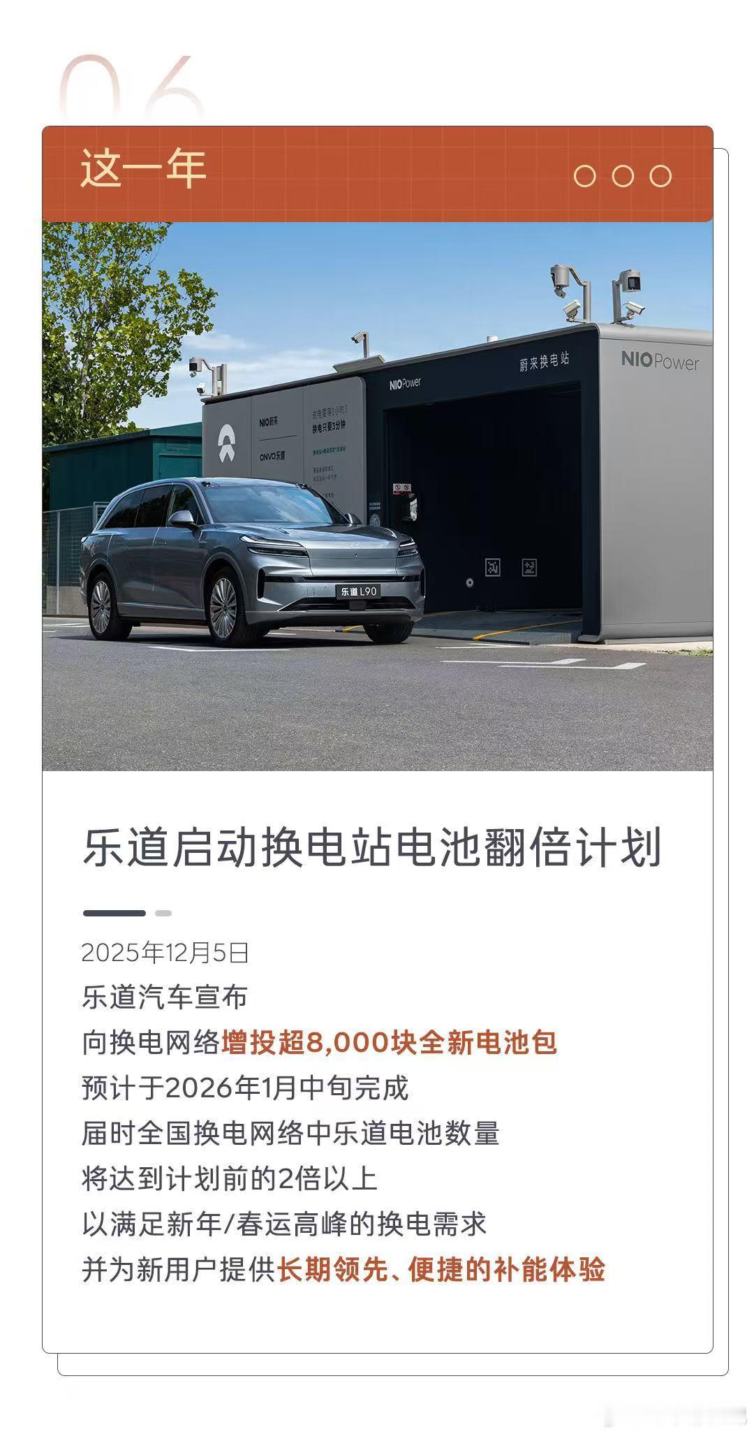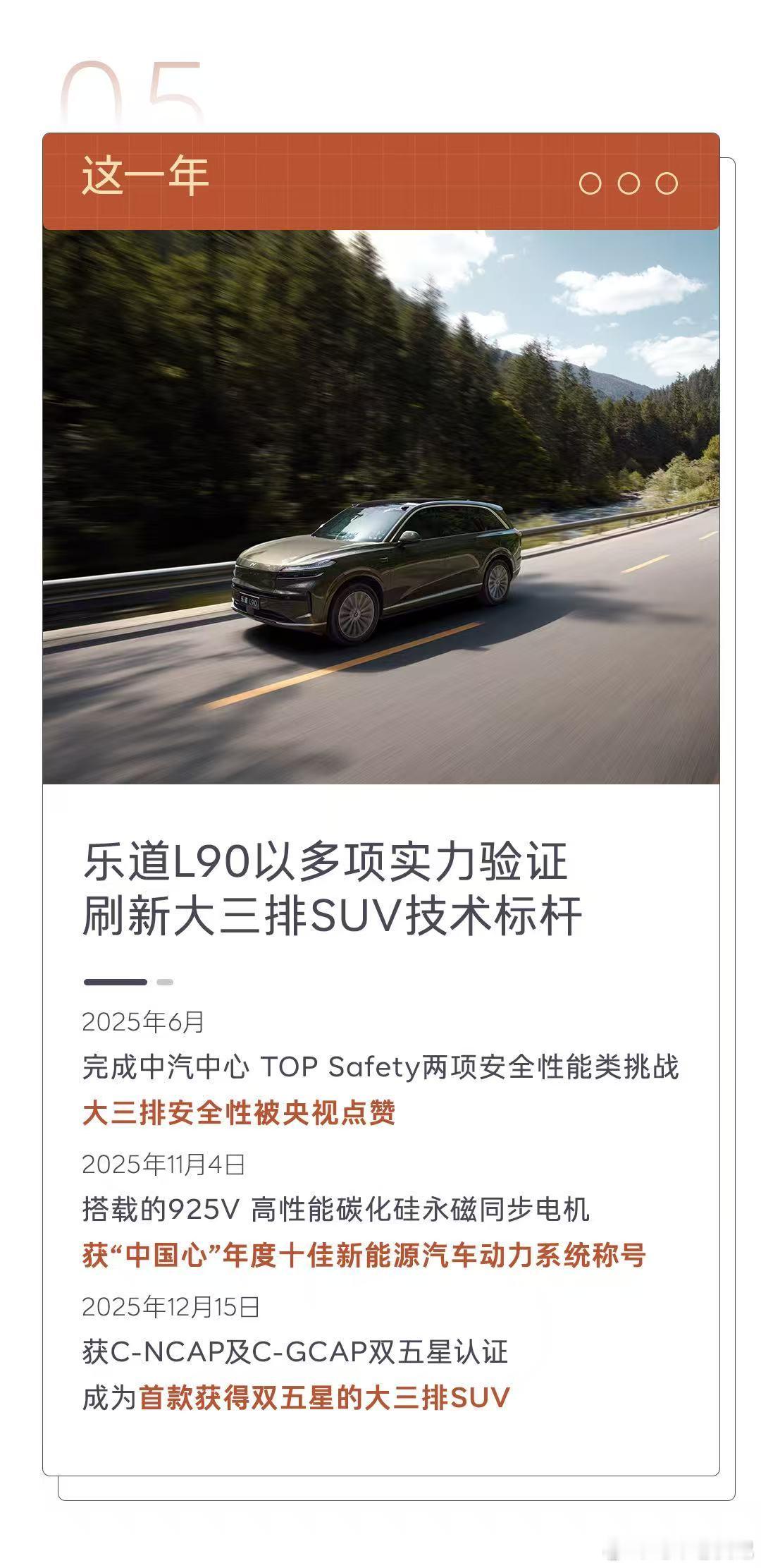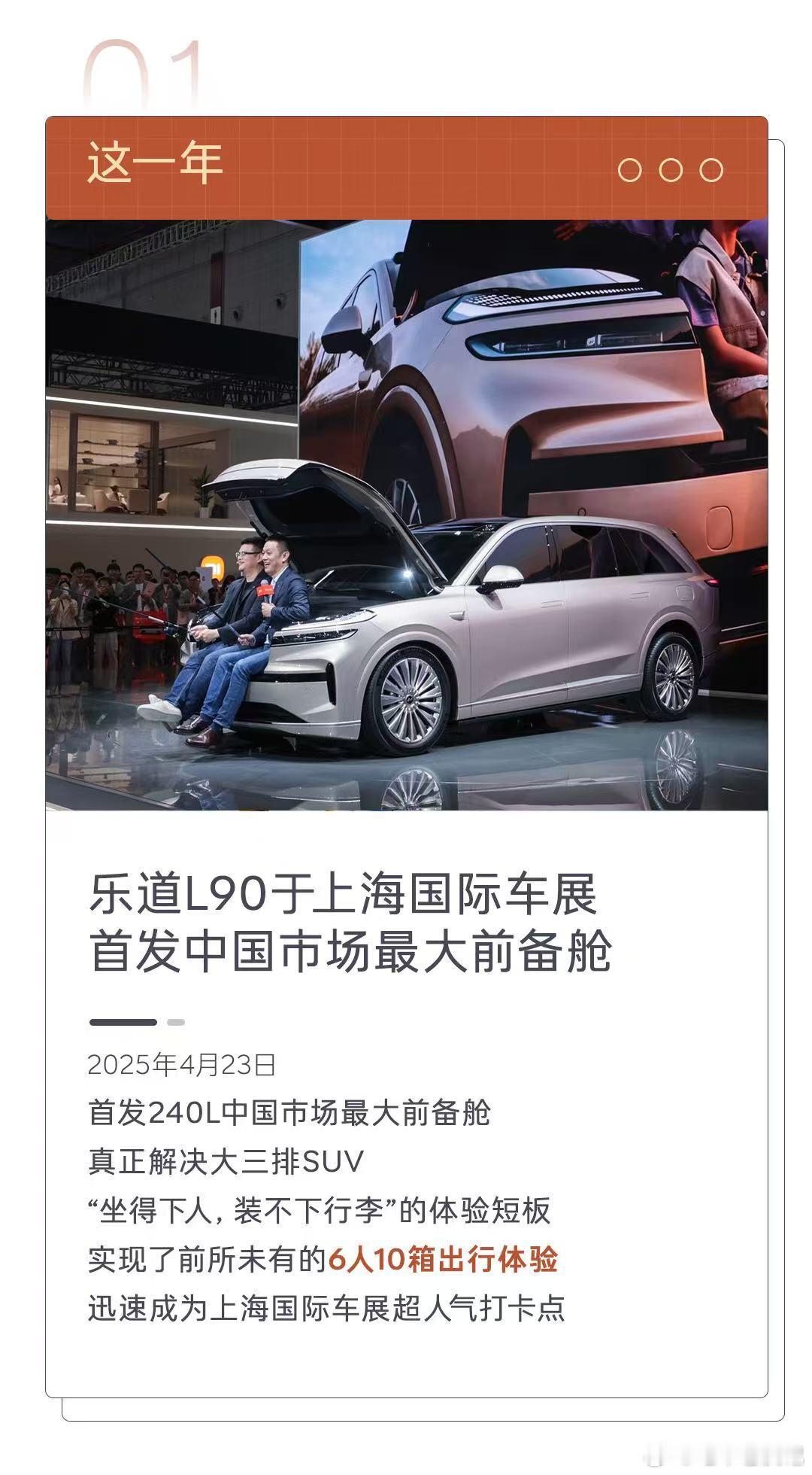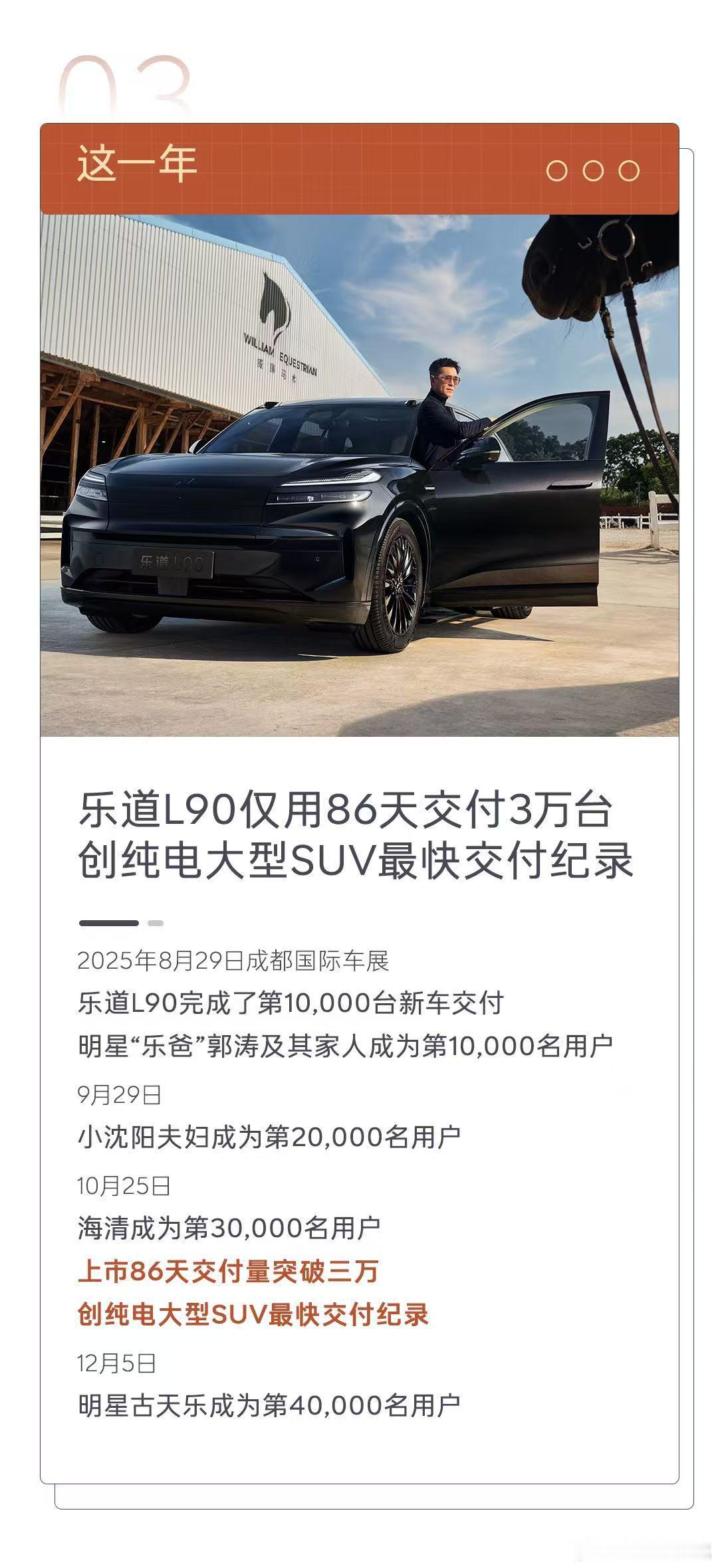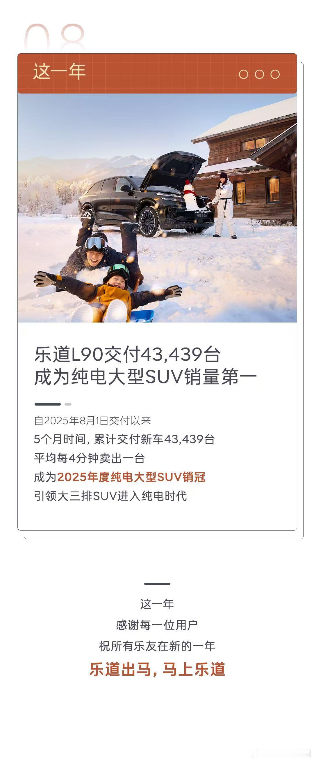 2025年📌乐道L90仅用5个月时间交付新车43,439台,成为2025年度纯电大型SUV销冠📌首发240L中国市场最大前备舱,实现前所未有的6人10箱出行体验,重新定义大三排SUV,并把前备舱带入比后备箱更好用的时代📌安全、健康、效率领先,成为大三排SUV首个C-NCAP&C-GCAP双五星认证车型,刷新大三排SUV技术标杆📌向换电网络增投8000块电池,满足新年/春运高峰换电需求📌与国民IP浙江卫视跨年晚会携手,特别嘉宾“前备舱”见证多个跨年热搜惊喜场面2026年,我们继续出发,一起加电乐道汽车
