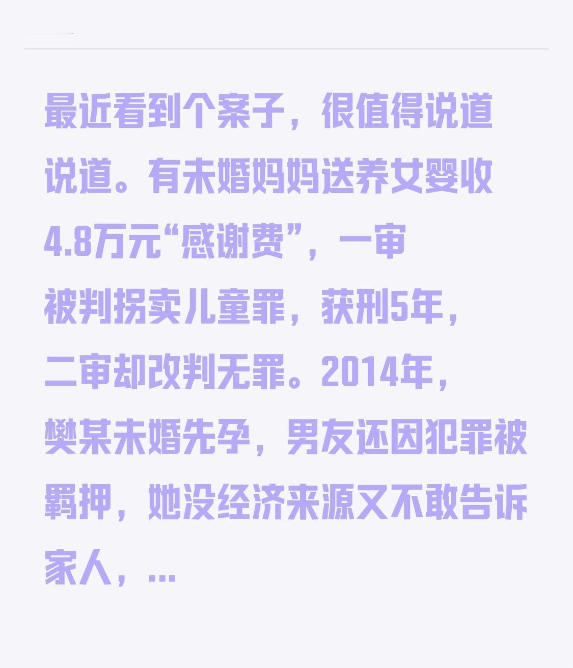 最近看到个案子,很值得说道说道。有未婚妈妈送养女婴收4.8万元“感谢费”,一审被判拐卖儿童罪,获刑5年,二审却改判无罪。 2014年,樊某未婚先孕,男友还因犯罪被羁押,她没经济来源又不敢告诉家人,就想送养孩子。黄某婚后多年无子,收养意愿强烈,主动联系樊某愿付“感谢费”。樊某和男友也多次商议,最后签了送养协议。 二审综合全案情节改判无罪,这案子厘清了民间送养与借送养之名出卖亲生子女的边界,说明法律判决还是会全面考量实际情况的。