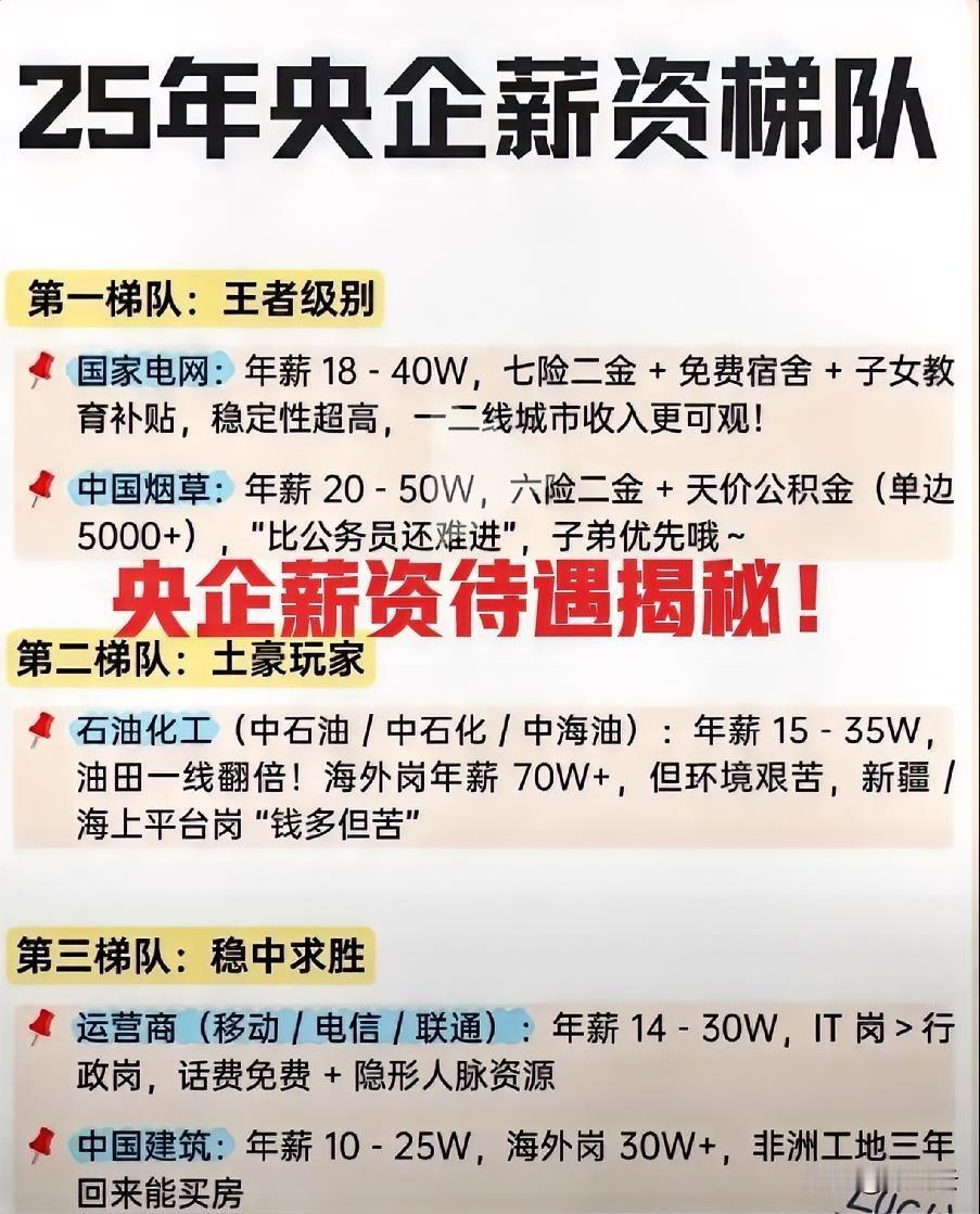 竟然差别这么大!最新央国企25年总部核心岗位薪资梯队排行榜揭秘!一图概览三梯队!第一梯队:王者荣耀是国家电网、中国烟草,总部岗位安安稳稳、轻轻松松,永不失业,干到退休;年薪18~40万!第二三梯队是哪些企业,薪资待遇怎么样?速速围观揭秘详细内容![点亮平安灯][点亮平安灯][招财进宝][招财进宝] 欢迎关注@叮咚云 将优先为粉丝职业规划指导,1对1咨询是付费服务,为你定制最适合的就业择业方案!欢迎留言交流讨论。[来看我][来看我] 免责声明:图片来自网络,仅供参考! 央国企求职条件 央国企求职 央国企招聘 央国企求职就业 央国企秋招