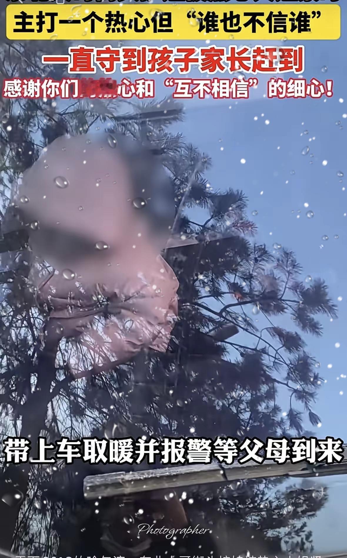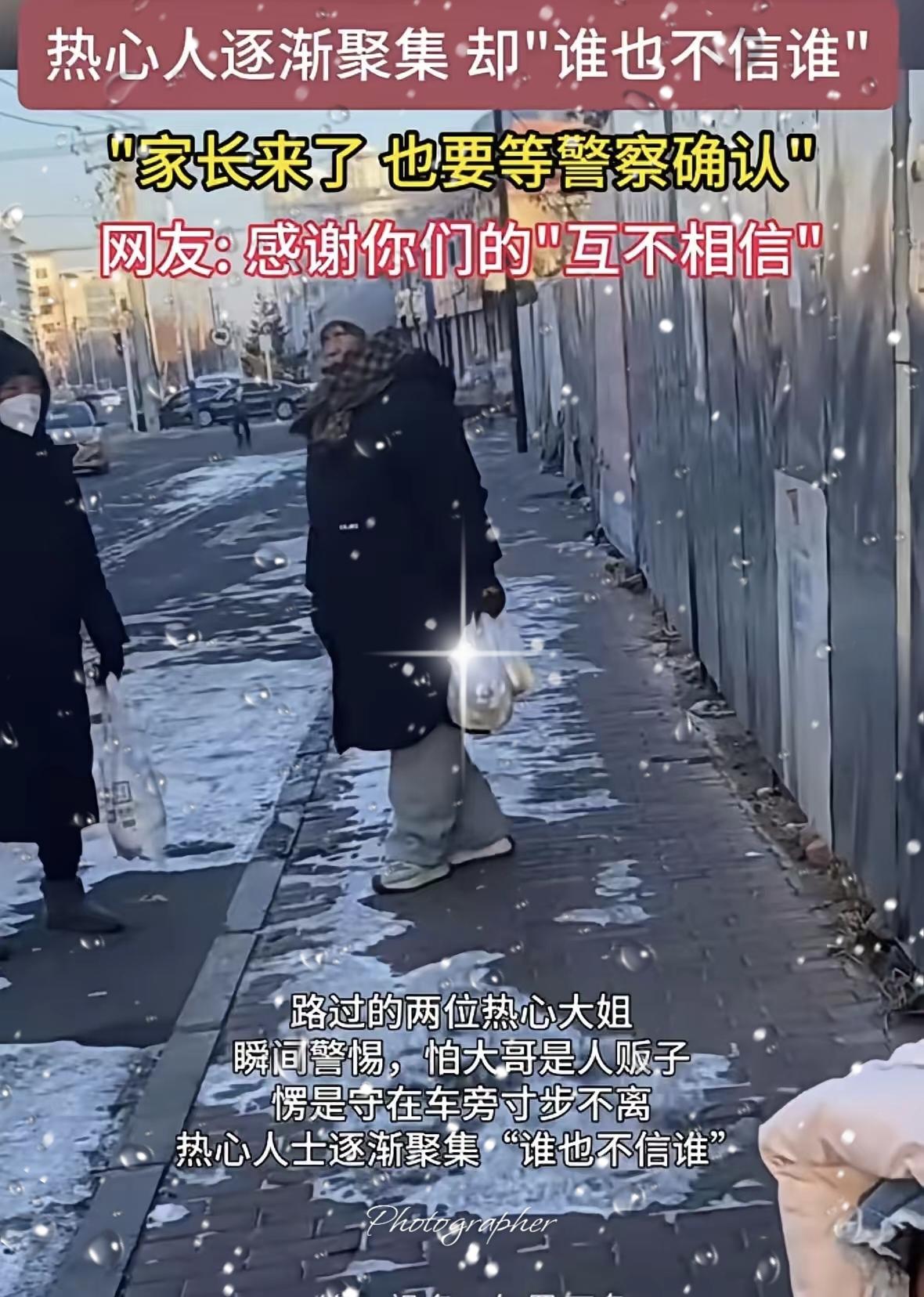“亲妈来了也得等警察到了再把孩子抱走,”哈尔滨三个大人谁也不信谁,围成一个“品”字,护一个走丢的 3 岁小女孩。网友:在东北丢啥都不能丢孩子。 早上 8 点的哈尔滨,零下 20°的寒风里,一位开着车正在等红绿灯的东北大哥看到一个没戴帽子手套口罩的女娃独自在街上溜达,手里还拿着手机,这位东北大哥一看孩子没有家长看护,八成是走丢了。 赶忙把车靠边儿,一路追着孩子,经过询问果然是走丢了。手里的手机也没有电话卡,孩子也只会说妈妈。 这哪是“互不信任”,分明是东北人刻在骨子里的清醒善良!大哥护娃上车取暖,大姨拎着粘豆包当“武器”戒备,连出租车司机的提议都被谨慎拒绝,这份警惕比单纯的热心更让人安心。 他们不信陌生人,却共同信着“孩子不能出事”的底线。亲妈来了都要反复核实,不是不近人情,而是把孩子的安全护到了极致。零下20℃的寒风再烈,也抵不过这份“多方制衡”的温暖。 真正的善意从不是盲目付出,而是带着分寸感的守护。你身边遇到这种情况,会像他们这样警惕又热心吗?