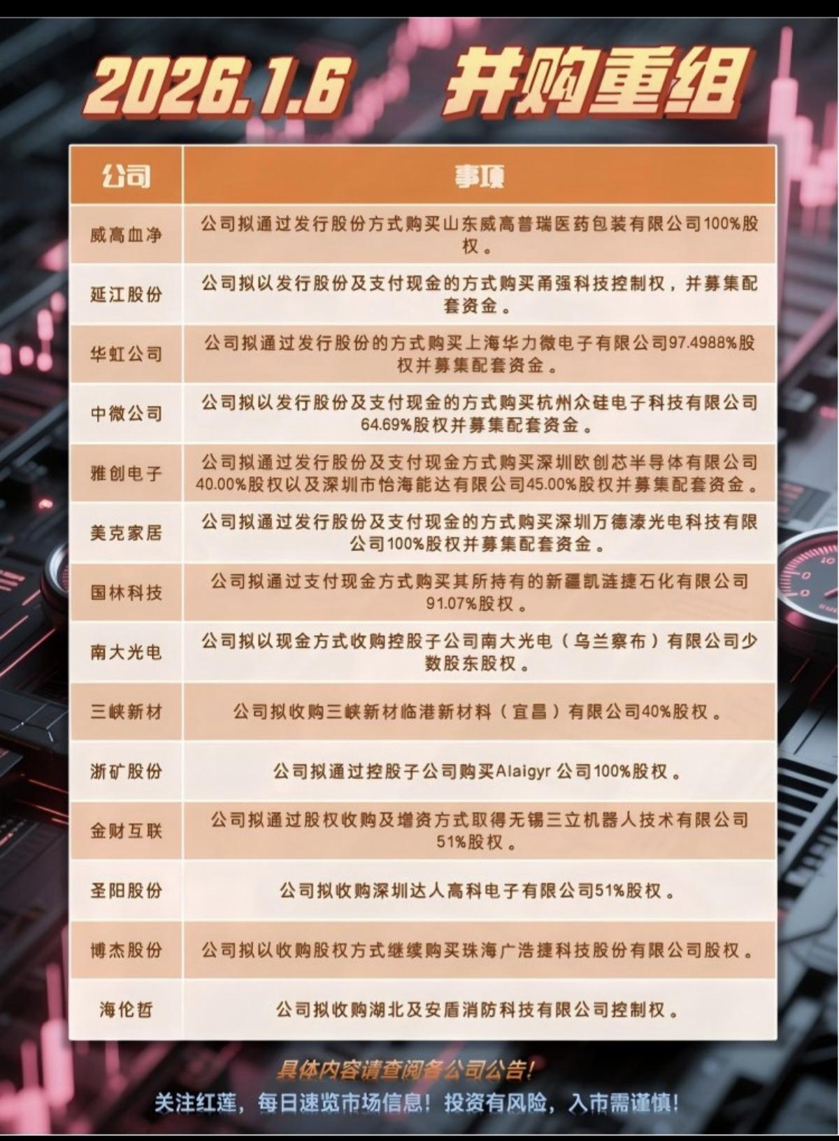 1.6周二 30家公司披露并购重组! 最新披露:30家上市公司并购重组。 并购重组事项,是高层推崇备至的战略规划,做大做强! 并购重组钴里寻找机会!