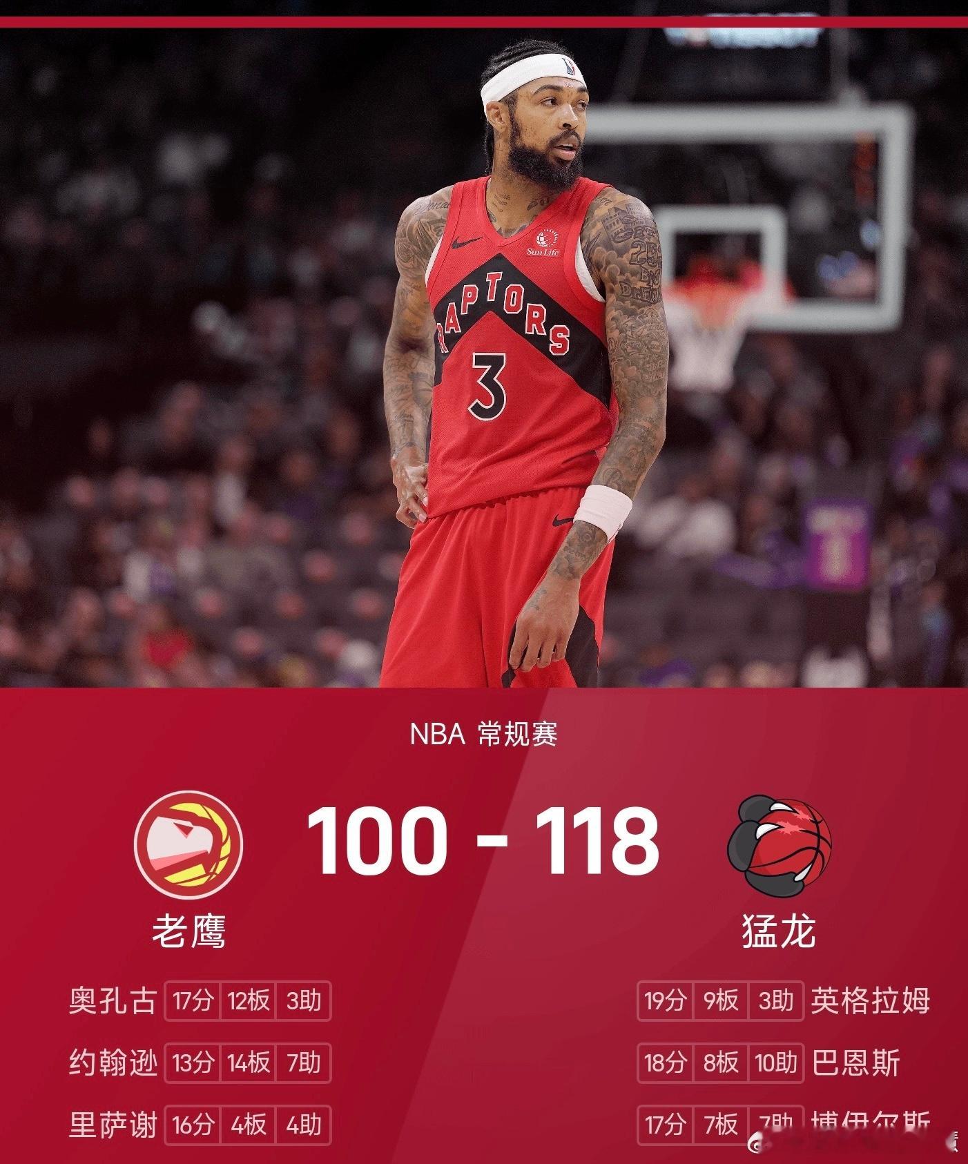 01月06日NBA常规赛,猛龙主场118-100击败老鹰。英格拉姆砍下19分9篮板3助攻,成为球队赢球关键。 首节猛龙以8-2开局,博伊尔斯、奎克利三分连发建立优势,老鹰末段轰10-0缩小分差,首节战罢猛龙31-26领先。次节双方冲突不断,巴雷特被追加技犯;老鹰一度将分差迫近至3分,猛龙依靠博伊尔斯带动的7-0攻势重新拉开比分,半场猛龙61-49领先12分。第三节里萨谢5犯后爆发砍9分打停猛龙,双方陷入得分荒,猛龙凭借巴恩斯助攻稳住局势,三节结束仍握13分优势。末节老鹰一波7-0迫近分差,猛龙依靠巴雷特、英格拉姆关键三分重新拉开差距;里萨谢六犯离场后,猛龙再掀攻势锁定胜局。