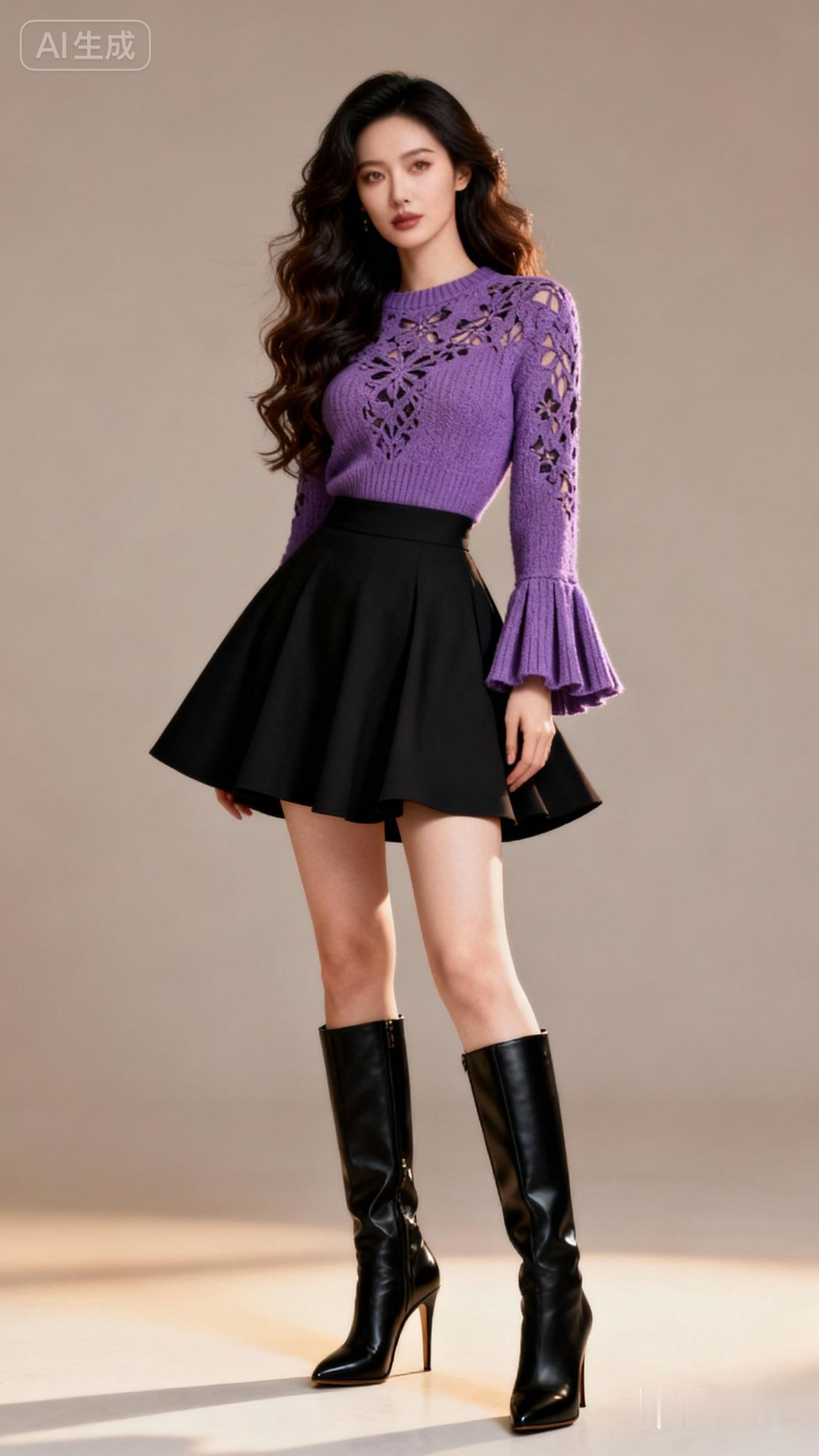 甜美与酷炫并存,紫色毛衣搭配黑色短裙,时尚感爆棚!