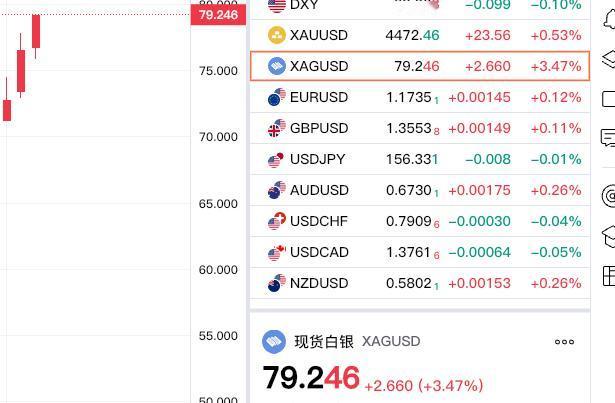 元旦后的, 贵金属价格再度大幅飙升。 现货白银价格79.246美元, 较上一日上涨2.66美金, 涨幅为3.47%。 如果今日不出现意外, 白银价格收红概率比较大, 也是元旦之后的第三次上涨, 有望实现三连涨。 对于白银后市, 期货小褚认为虽有继续上攻的可能性, 但是短期压力激增, 获利平仓比较好!