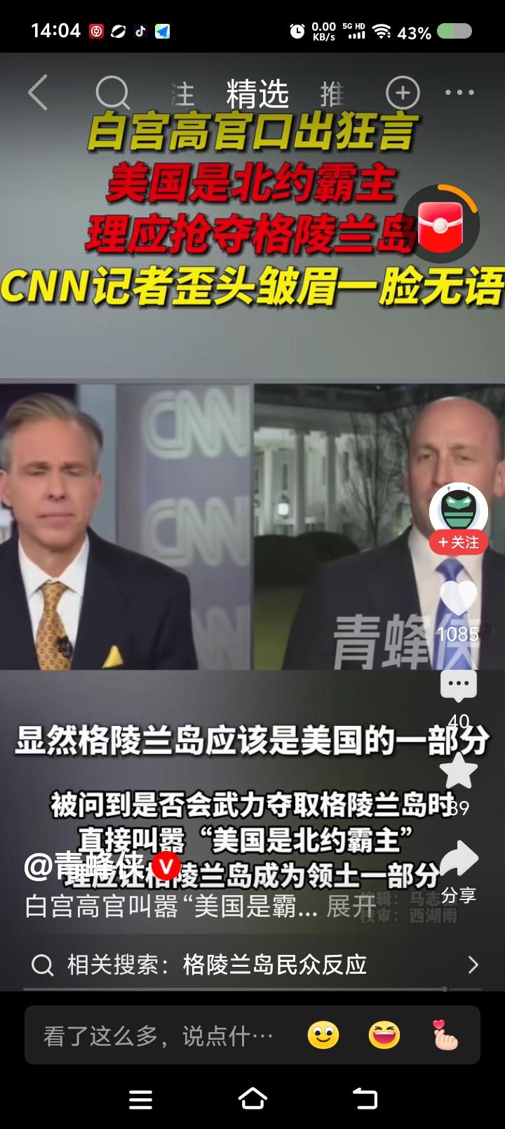 美国高官把CNN记者搞郁闷了!—— 网上视频:美国高官米勒对CNN记者说:“丹麦凭什么控制格陵兰岛?它有什么依据管理它?美国是北约霸主,为了美国的安全,为了北约的利益,格陵兰岛应该成为美国的一部分。” CNN记者一脸懵,无言以对。 点评: “北约霸主”? 民主自由的美国病了!