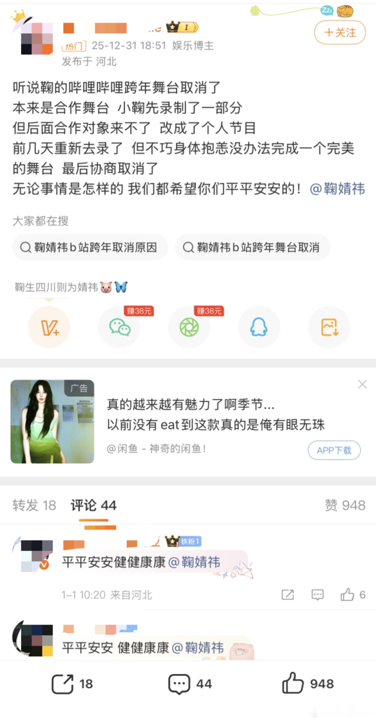 搜了一下真的没营业没跨年舞台,小鞠丝说是身体抱恙,但提前录制的晚会时间很充足,怎么可能短暂不舒服就取消,这理由很牵强。