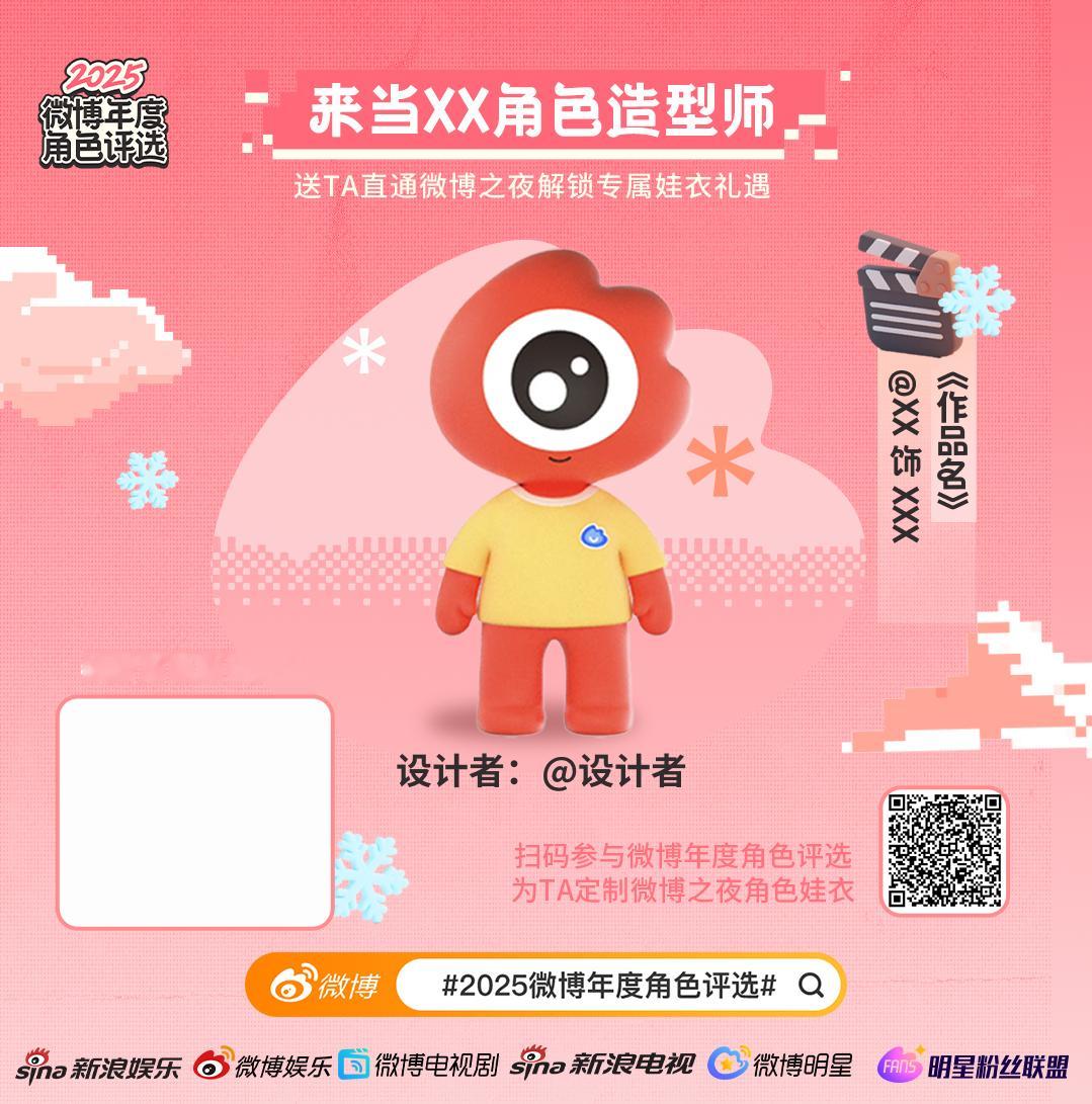 全体粉丝看过来!电视剧大赏 大眼杯表彰小会惊喜返场✨ 2025微博年度角色评选 火热开启,100 个宝藏角色闪亮集结 ,TOP12角色将解锁微博之夜角色专属娃衣,为你爱的角色设计娃衣的机会来了!参与方式 :1. 即日起至1月13日,点击链接2025微博年度角色评选为本命送出喜爱值2.带 也是当上我担的角色造型师了 话题投稿你为TA创作的浪gogo娃衣设计图评选结束后将发起「TOP12角色浪gogo设计大赏」对投稿的创意设计进行集中展示,你的设计超有可能成为最终娃衣造型!亲手为担做造型,快来参与让 TA 闪耀全场!✨
