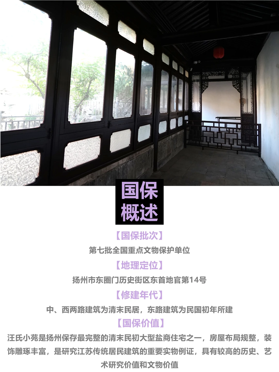 汪氏小苑是汪竹铭作为盐商发家后所建私宅,目前遗存建筑近百间,建筑面积1580余平方米,是扬州保存最完整的清末民初盐商住宅之一,是研究江苏传统居民建筑的重要实物。汪氏小苑房屋布局规整,横为三路并列,纵为主房三进延伸,厅前屋后开辟“可栖”、“小苑春深”和“迎曦”小苑,以苑辅宅的设计使住宅和小苑揉为一体,宅庭院比例均衡,保证了住宅通风采光充足和各路建筑的互联相通。小苑装饰雕琢丰富考究,体现了富商的风雅追求。