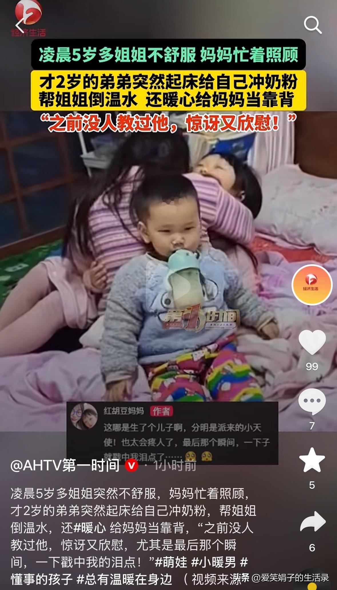 太暖心了!四川南充,一女子发视频称,女儿肚子不舒服,她忙着照顾,没想到才2岁的儿子下床,给自己冲奶粉,帮姐姐倒了温水,最后还暖心的给妈妈当靠背。网友:这大概就是生二胎的意义吧! 凌晨5点多,女儿突然肚子不舒服,女子赶忙起床抱着女儿,给她揉肚子。 这时,才2岁的儿子也醒了,快速的溜下床,女子以为他要上厕所,没想到儿子接下来的动作,直接把她感动哭了。 只见小家伙来到餐桌,拉开椅子,手脚并用的爬上去,拿起自己的奶瓶,打开盖子,熟练的按下泡奶机,给自己冲了一杯奶,原来他不是上厕所,而是饿了。 随后他又找到姐姐的水杯,帮忙接了半杯温水,然后小心翼翼的从椅子上爬下去,抱着两个杯子小跑来到卧室。 小家伙笨拙的爬上床,来到妈妈身旁,把姐姐的水杯递给妈妈,女子的脸上写满了惊讶,瞬时一股暖流涌上心头。 姐姐喝完水后,他又帮忙把杯子轻轻的放到桌子上。转身从枕头边拿起小毯子,吃力又笨拙的给妈妈盖在了后背上,或许他想着妈妈坐在床边抱着姐姐太累了,最后安静的给妈妈当了“靠背”,这才拿起自己的奶瓶喝起了奶。 女子表示,当时孩子爸爸在单位上夜班,儿子做的这一切,是她后来看监控才发现的,平时根本没有任何人去教过他。 她感慨道,这哪是生了个儿子,这分明是派来的小天使,太会心疼人了,最后那个动作,直接戳中泪点。 这个小家伙真是太暖了,我认为孩子做的这些,他的爸爸应该是做过,孩子看见过所以学会了,这大概就是言传身教的意义吧。 我们总以为孩子懵懂无知,总是需要被照顾,殊不知他们早已默默记住了,父母照顾家人的模样。 姐姐难受时递上的温水,妈妈疲惫时笨拙地盖上毯子,都来自他最简单的观察与模仿,他看见了爱,便学着用自己小小的方式给出爱。 这最质朴的回馈,比任何刻意的教育都珍贵,它让那些辛苦的日夜,一瞬间被温柔照亮。