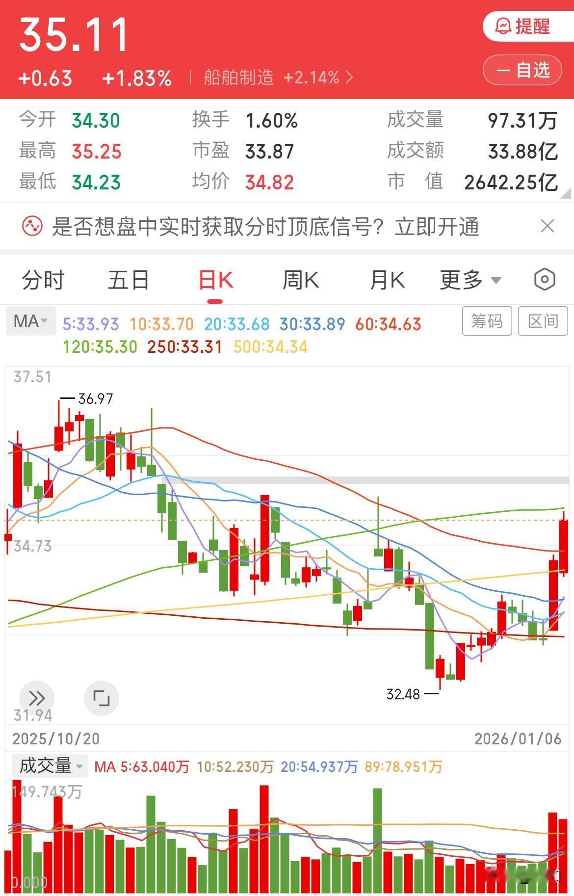 船舶反弹是否即将终结? 今日船舶小幅低开后,旋即掉头向上。午后成功突破35的压力位,当日涨幅达1.83%。 其反弹行情是否要结束了? 就目前而言,船舶已行至压力位。上方紧邻半年线以及前期向下跳空缺口,压力巨大。若明日能继续放量,或许有机会触及该位置。 从技术层面分析,当前已处于超买状态。若向上触碰压力位却无法站稳,便可能…… 当然牛市已然来临,船舶今年的表现值得期待。上涨途中的任何回调皆是机遇。 大家可阅读这篇文章。 点击链接打开👉 [链接]展望2026,中国船舶会驶向何方 Tt8aqgRf4Lw` Axw:/ W@m.DH :5am 复制此条消息,打开「今日头条APP」 或「今日头条极速版APP」后直接查看~ 船舶 船舶行业 船舶走势 船舶行情