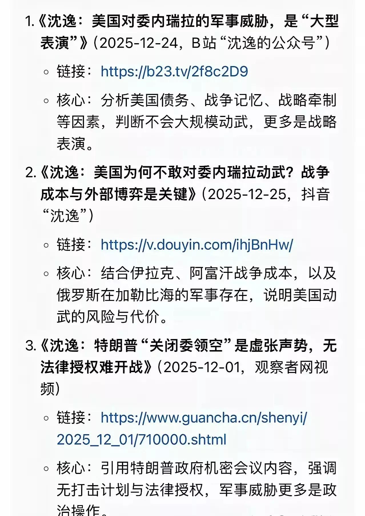 老实说,自沈逸老师这几年横空出世后,就没图1这两位啥事了。 沈逸老师是真正的学院派,考据完备,描绘逼真,谈吐平和理性,逻辑严密,完美地演绎了什么是"荒诞的真实",这是大师级的。 还有一位是侯汉廷,那也是现象级的。他说美帝抓捕马杜罗,是"战术上赢了,战略上输了"。 我就问李莉老师和杜文龙老师,你们服不服? 这个赛道想混碗饭吃,容易吗? 竞争太激烈,各方面都在内卷。 正所谓"江山代有才人出,各领风骚数百年。"